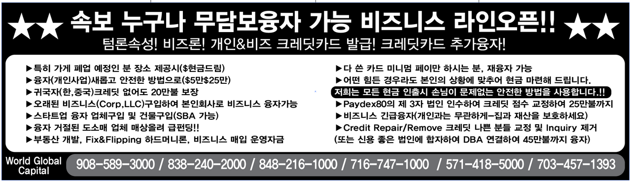 저희 회사는 각종 융자 및 크레딧 카드를 통해 필요하신 자금을 최대한 많이, 최단기간에 마련해 드립니다.