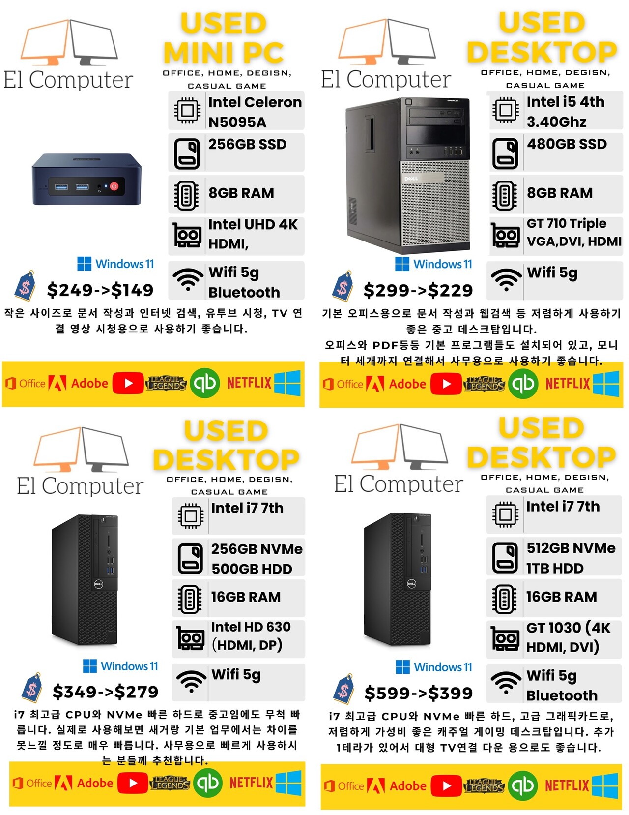 상태 좋은 중고(데스크탑, 올인원, 랩탑) 최저가로 판매합니다. 기본프로그램들, 영상, 사진 작업 프로그램들 다 설치되어 있고, 최적화 되어 있습니다.