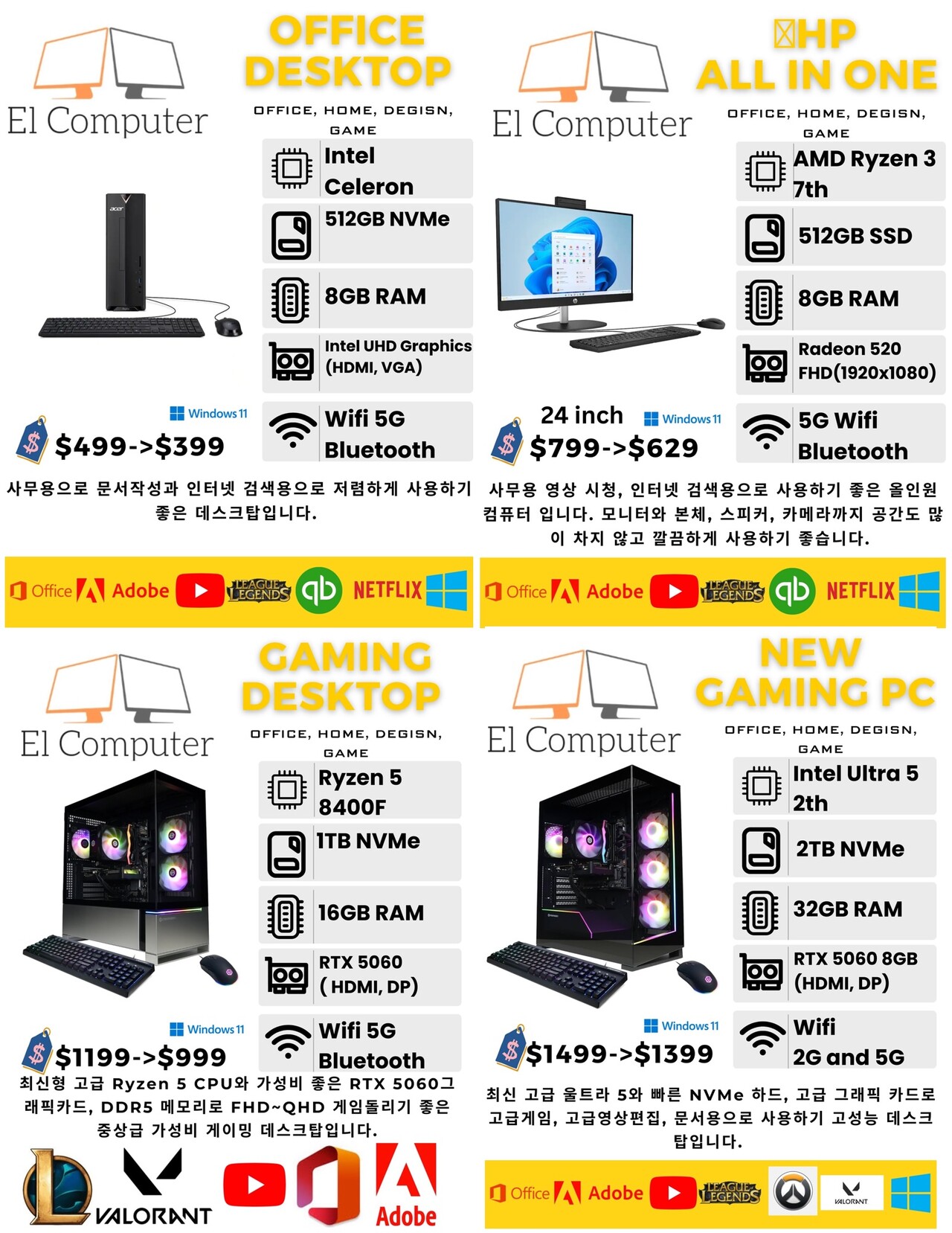 New(데스크탑, 올인원, 랩탑) 최저가로 판매합니다. 기본프로그램들, 영상, 사진 작업 프로그램들 다 설치되어 있고, 최적화 되어 있습니다.