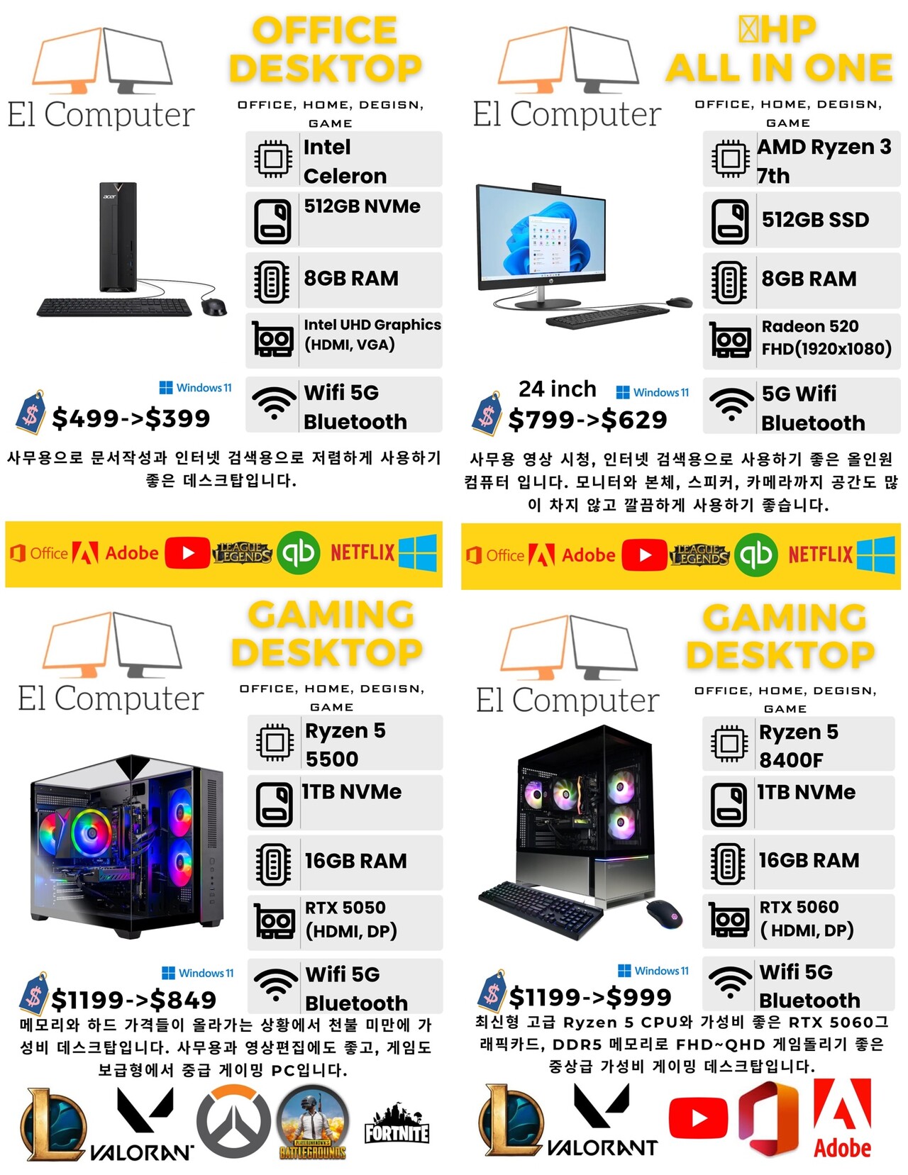 New(데스크탑, 올인원, 랩탑) 최저가로 판매합니다. 기본프로그램들, 영상, 사진 작업 프로그램들 다 설치되어 있고, 최적화 되어 있습니다.