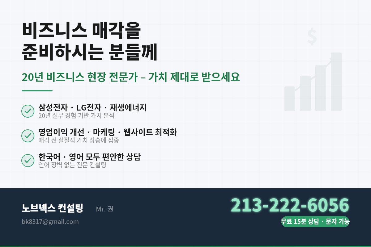 저는 미국 내 삼성전자, LG전자 등에서 20년 넘게 영업·마케팅·사업운영을 담당한 경험을 바탕으로, 매각 전 비즈니스 가치를 실질적으로 올리는 데 집중합니다.