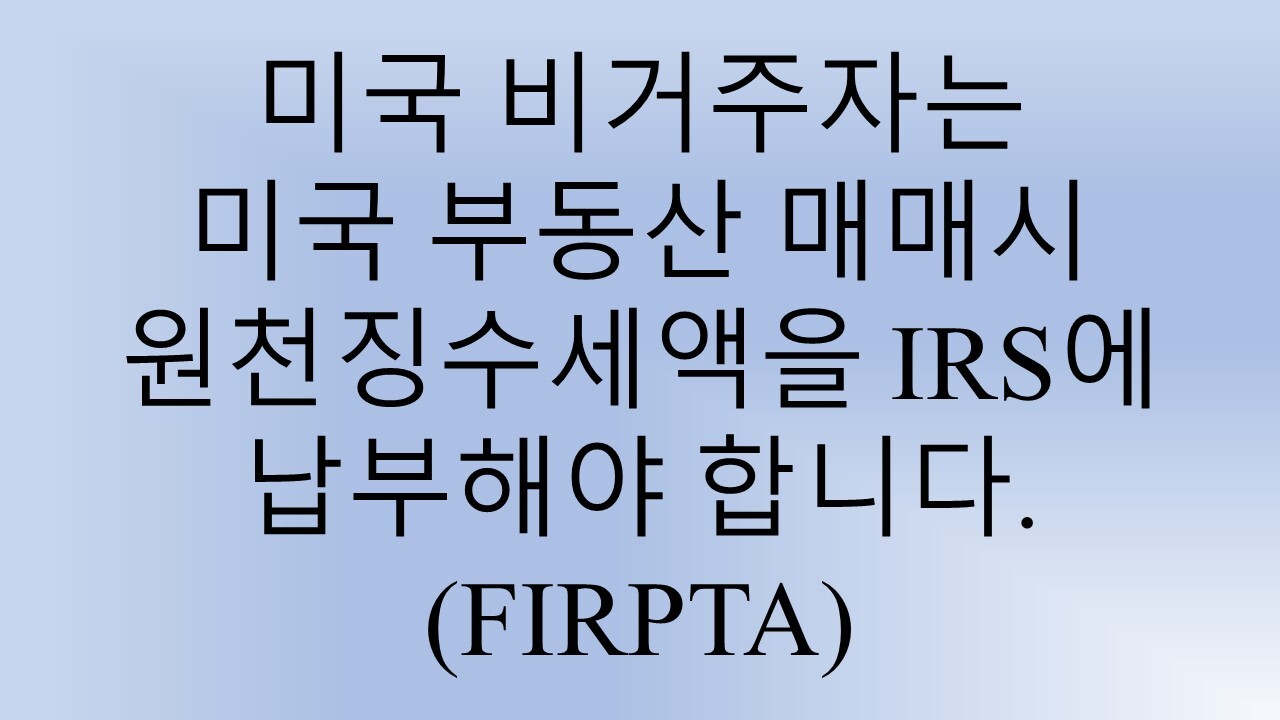 미국의 비거주자인 한국인이 미국내 부동산을 매각할 때 일정조건하에서는 FIRPTA(외국인부동산투자세법)가 적용됩니다. 부동산 매각차익의 일정부분이 아닌 부동산 매각대금의 10% 또는 15%을 미국 국세청(IRS)에 원천징수 형태로 납부해야 합니다. State 에서도 연방과 유사한 법이 적용됩니다.