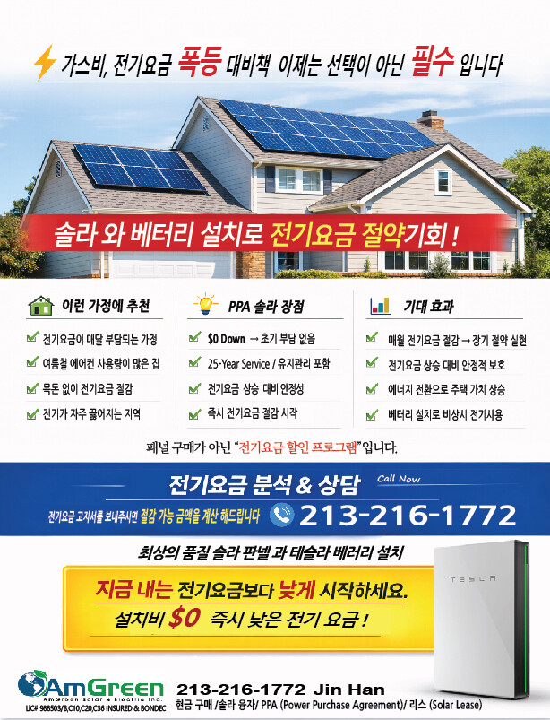 ⚡️최상의 품질 솔라 판넬 과 테슬라 베러리 설치로 전기요금 절약기회 !
