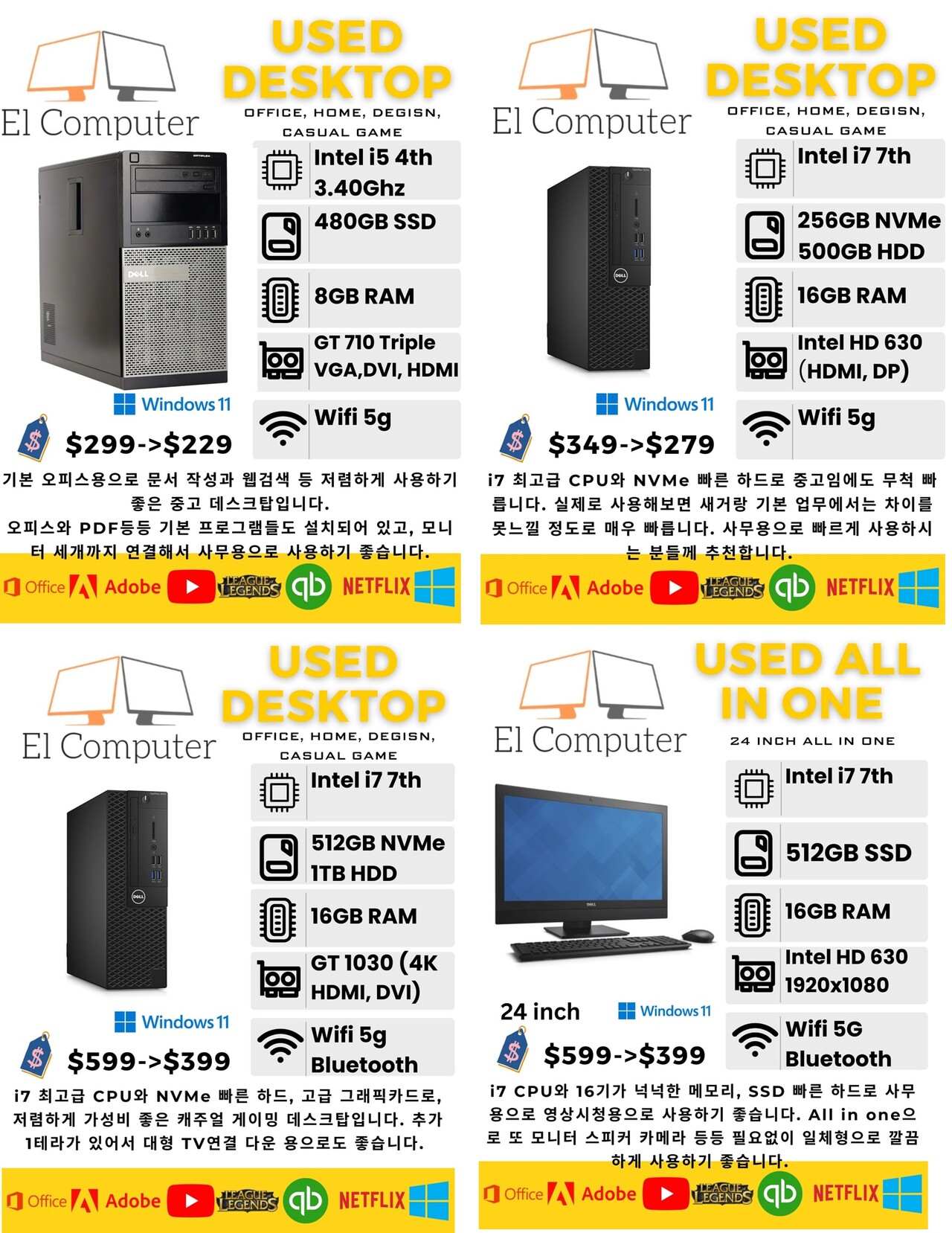 상태 좋은 중고(데스크탑, 올인원, 랩탑) 최저가로 판매합니다. 기본프로그램들, 영상, 사진 작업 프로그램들 다 설치되어 있고, 최적화 되어 있습니다.