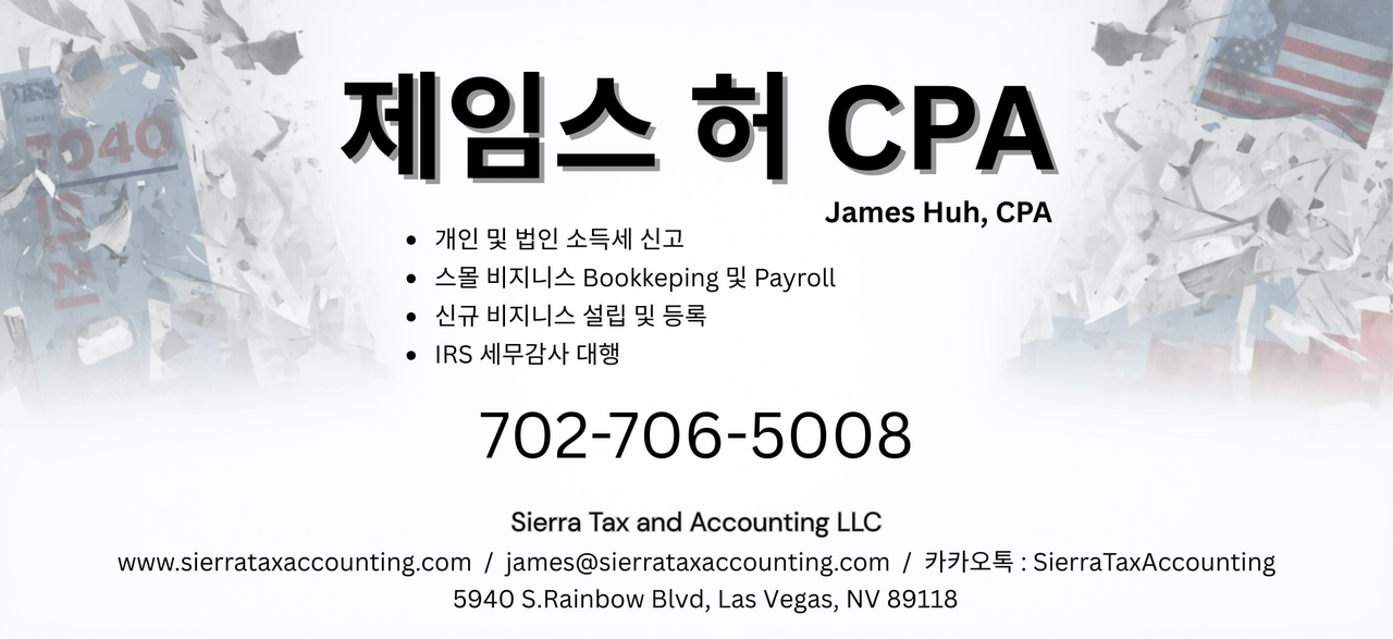 James Huh, CPA는 네바다주를 기반으로 미국 전역, 그리고 한국을 포함한 전 세계 거주 납세자를 위해 신속하고 정확한 맞춤형 세무 솔루션을 제공합니다. 복잡한 세무 이슈, 전문적인 CPA의 시각으로 명쾌하게 해결해 드립니다.