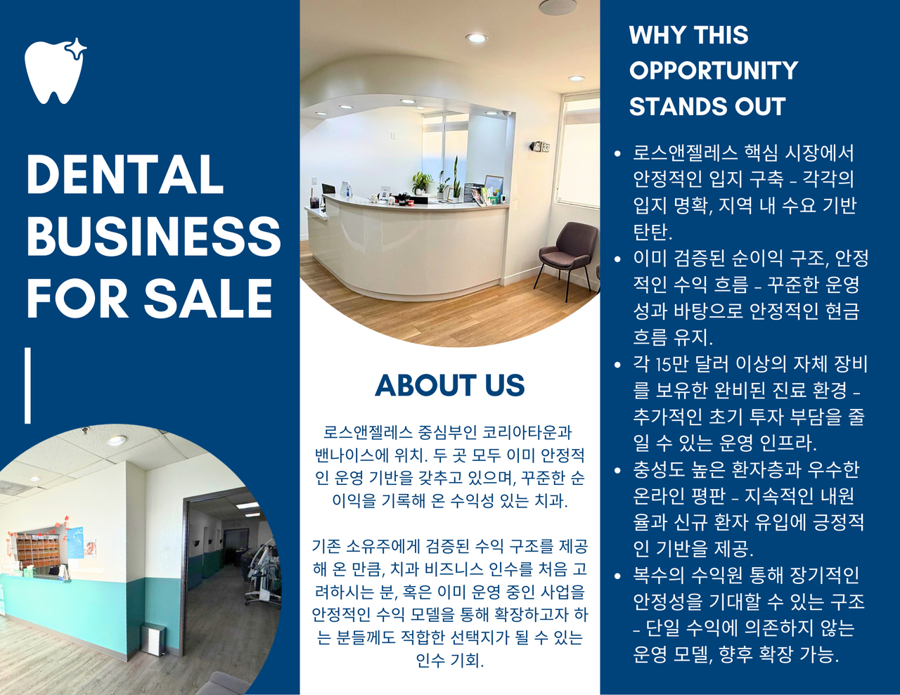 현재 오너님의 **타주 이전(Relocation)**으로 인해 매물로 나온 사례이며, 이미 견고한 이익을 창출 중인 치과 비즈니스를 인수할 수 있는 기회에 관심 있으신 분들은 아래 연락처로 문의 부탁 드립니다.
