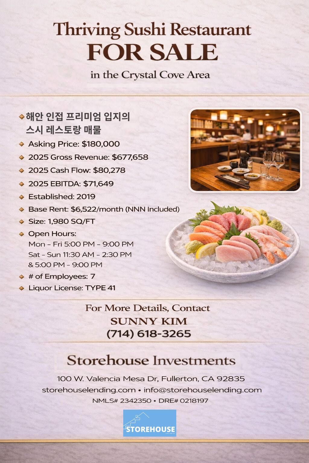 해안 인접 프리미엄 입지의 스시 레스토랑 매매 합니다.