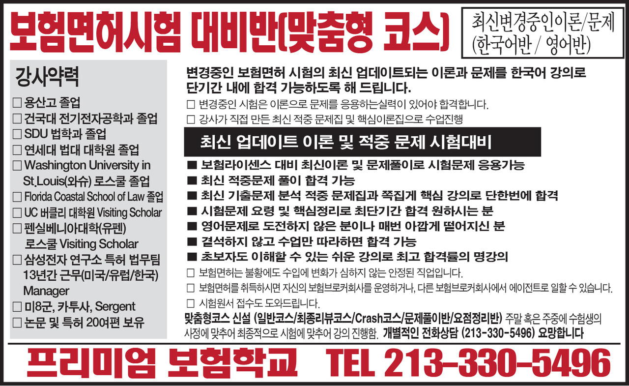 맞춤형코스(일반코스/최종리뷰코스/Crash코스/문제풀이반/요점정리반): 주말 혹은 주중에 수험생의 사정에 맞추어 최종적으로 시험에 맞추어 강의진행함: 개별적인 전화상담(213-330-5496)요망