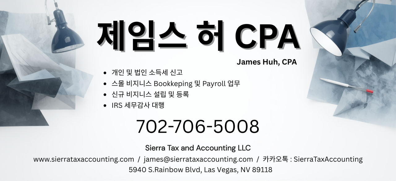 James Huh, CPA는 네바다주를 기반으로 미국 전역, 그리고 한국을 포함한 전 세계 거주 납세자를 위해 신속하고 정확한 맞춤형 세무 솔루션을 제공합니다. 복잡한 세무 이슈, 전문적인 CPA의 시각으로 명쾌하게 해결해 드립니다.