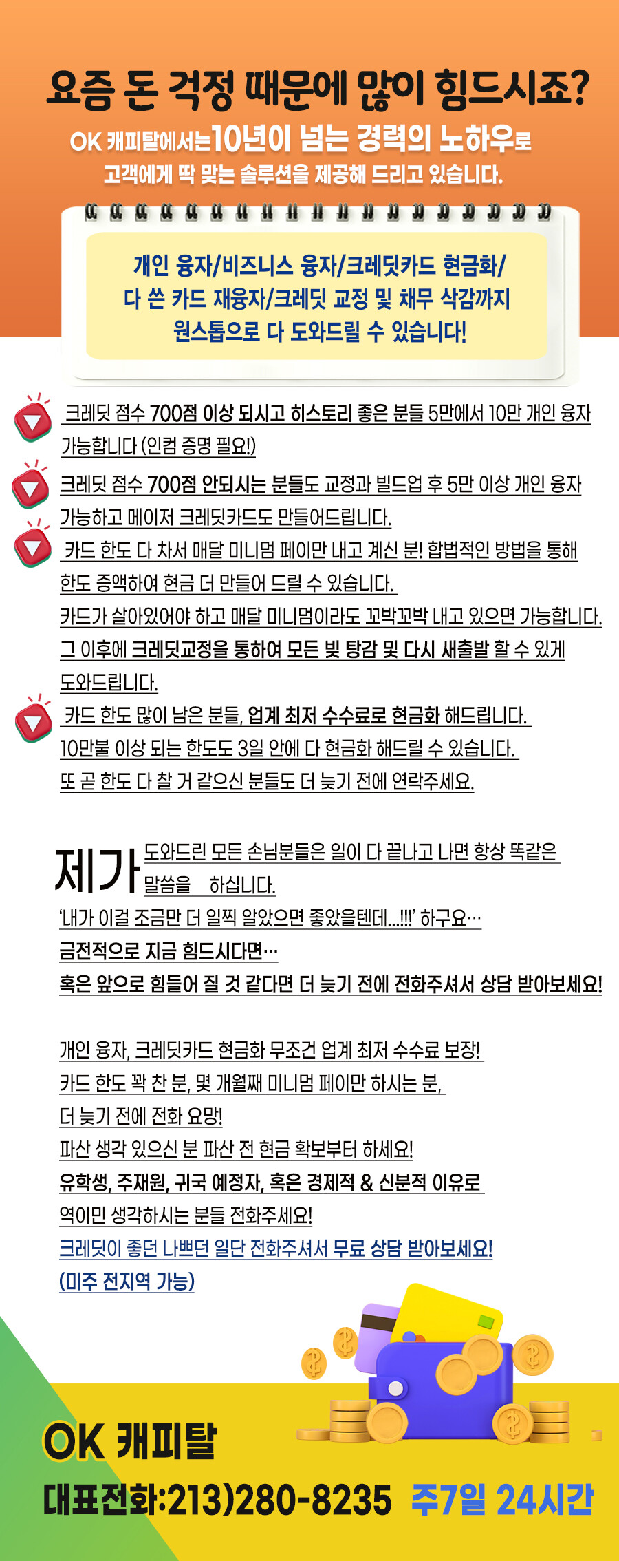 *카드 한도 남은 분들, 캐쉬화 해드립니다. 캐쉬 어드밴스는 큰 금액을 뽑지도 못할뿐더러 수수료에다 연 20%가 넘는 이자를 내야합니다. 저희는 10만불 넘는 한도도 다 현금화 해드릴 수 있습니다. 또 곧 한도 다 찰거 같으신 분들도 더 늦기전에 연락주세요.
