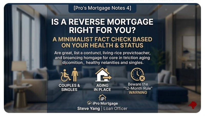 iPro Mortgage의 스티브 양입니다. 지난 시간에 은퇴 후 내 집을 든든한 연금으로 활용하는 리버스 모기지의 기본 개념에 대해 알아보았습니다. 상담을 하다 보면 내 친구가 하니까 나도 무조건 해야지라고 생각하시는 분들이 종종 계십니다.