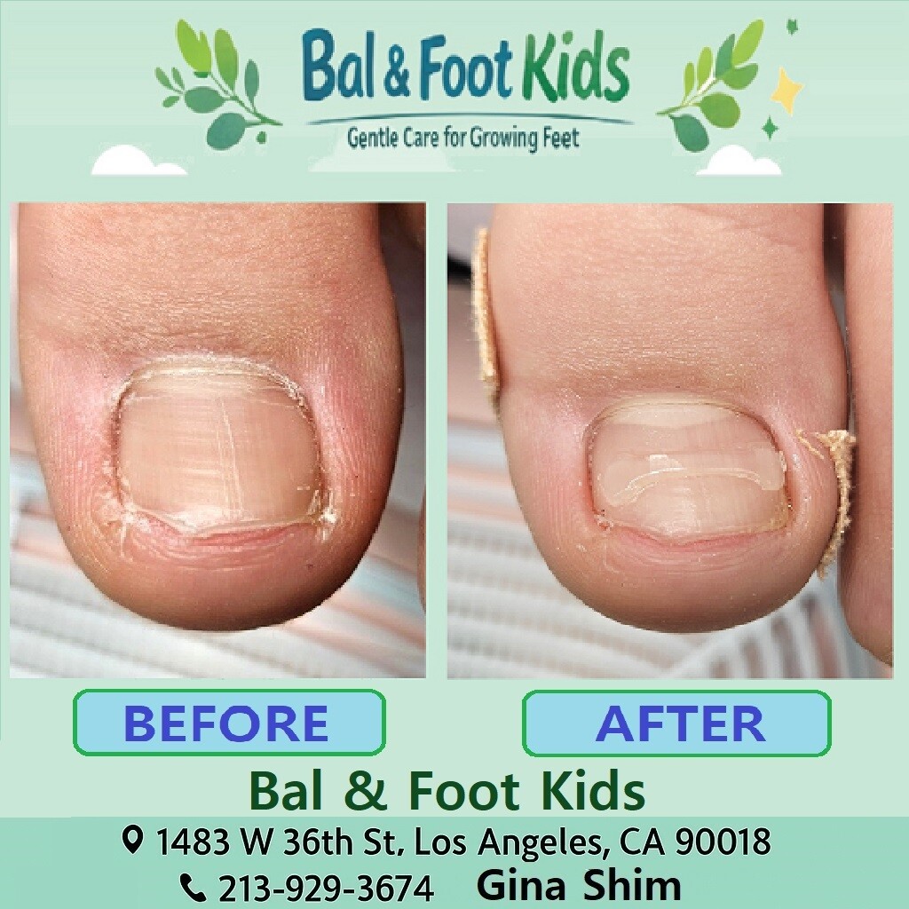 Bal & Foot Kids는 아이 전용 부드러운 한국식 교정 방식으로 성장기 발톱 방향만 바로 잡아 자연스럽게 정상 발톱으로 유도합니다.
