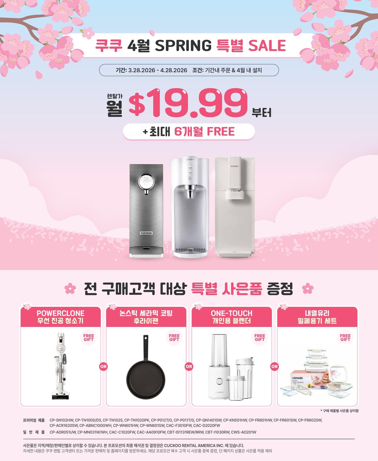 3건 주문시/렌탈 1건 포함 (5/6년 계약시) : 3개월 렌탈료 FREE / 등록비 총 $300 면제 / 사은품: 무선 진공 청소기