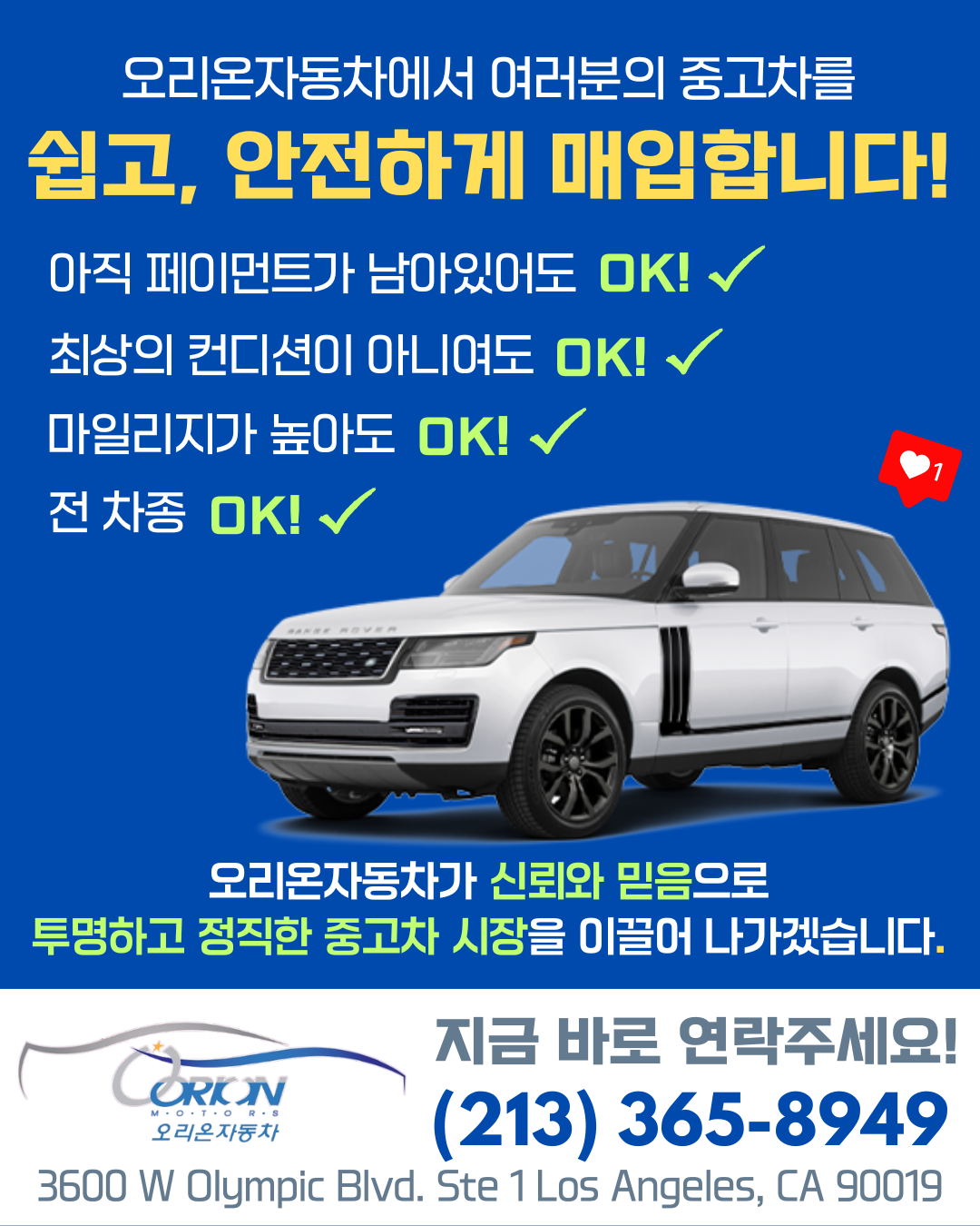 이제는 오리온자동차가 한인들의 기대치를 넘어서는 투명하고 정직한 중고차 거래를 이끌어 나가겠습니다.