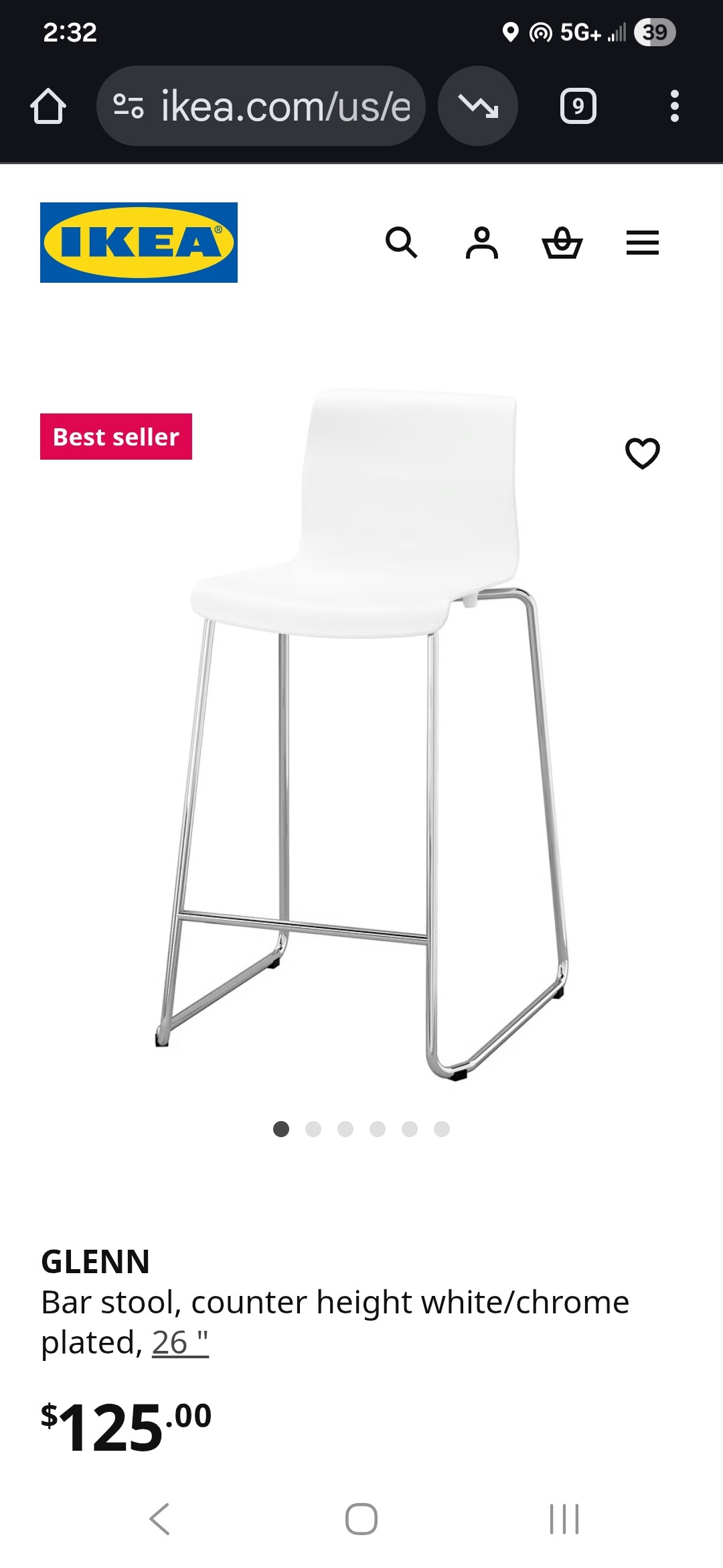 IKEA GLENN HIGH CHAIR Bar stool, counter height white/chrome plated, 26 "