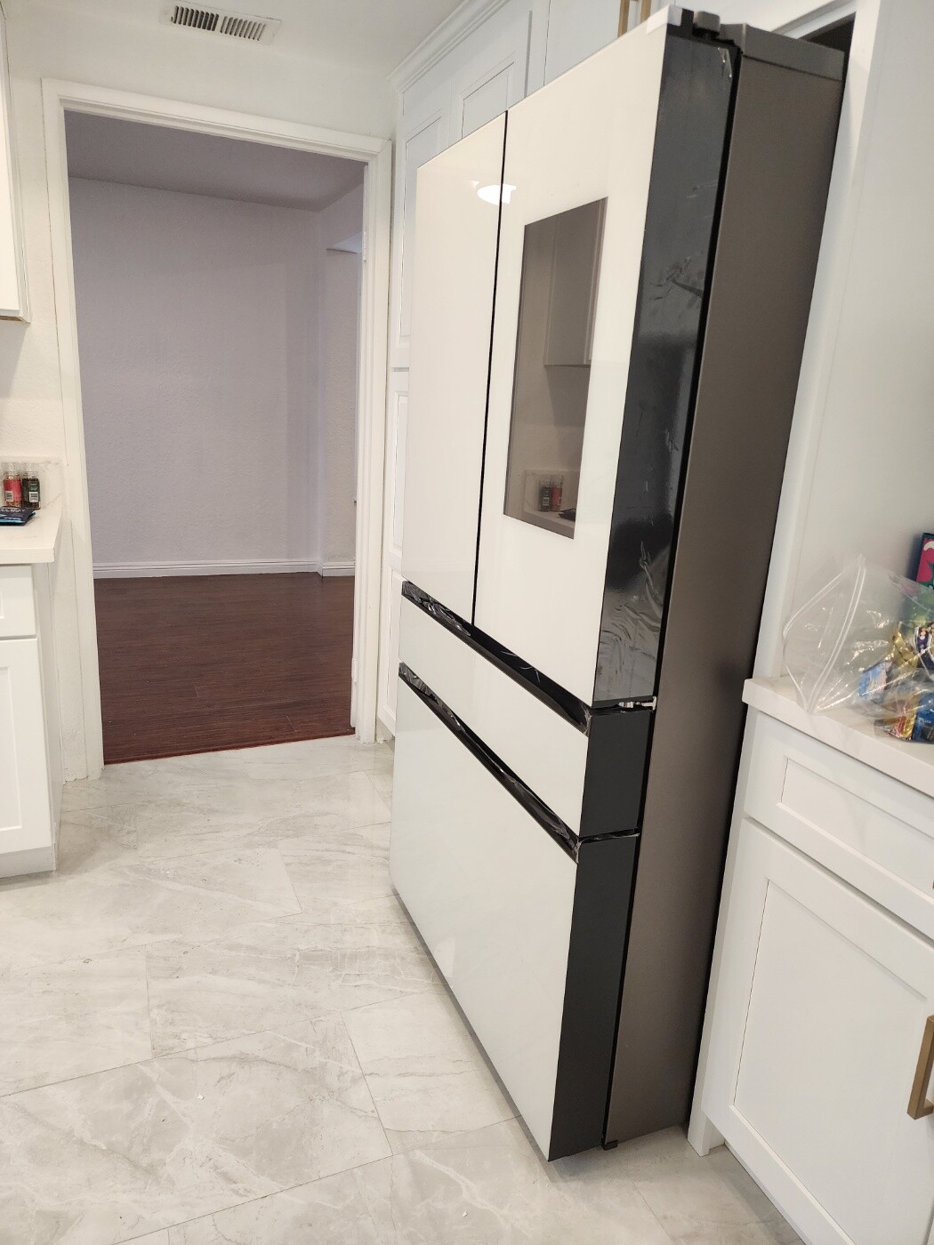 설명: Bespoke 29 cu. ft. Standard Depth 4-Door French Door Refrigerator in White Glass with Family Hub