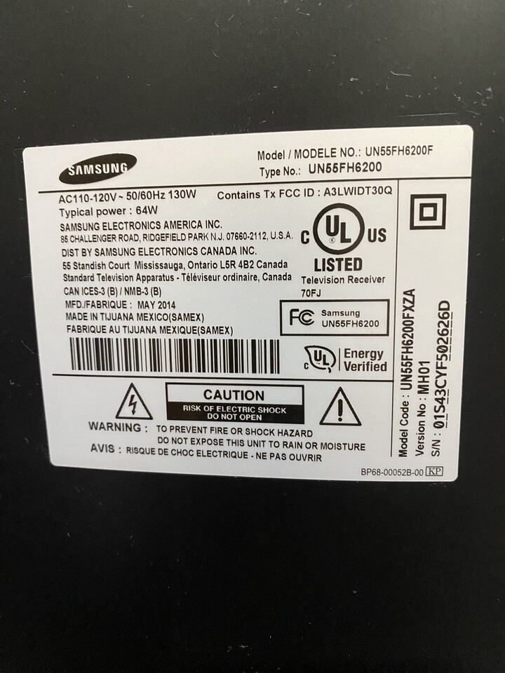 55인치 (실제 화면 크기 54.6인치) Full HD LED TV로 2013 Samsung UN55FH6200F 모델 입니다.