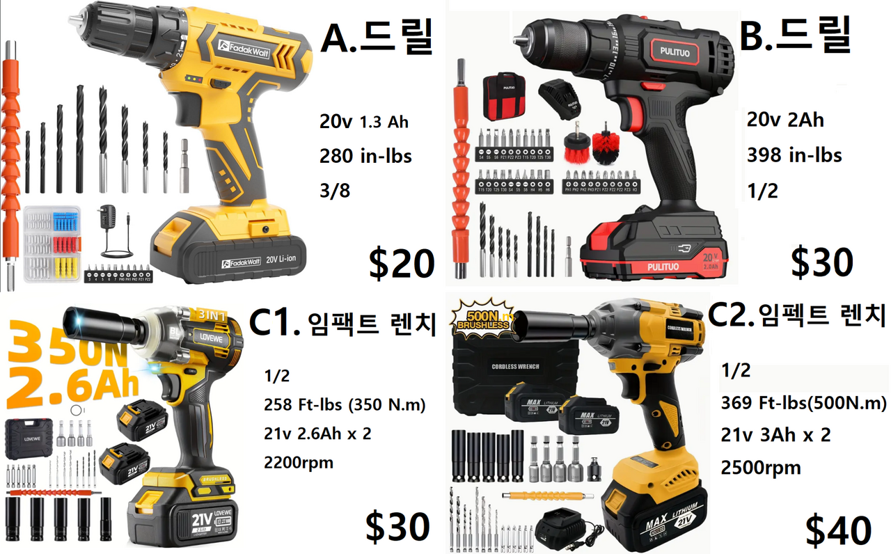 ❌ A. 드릴 $20 ( 20v 280 in-lbs , 3/8 ) ❌