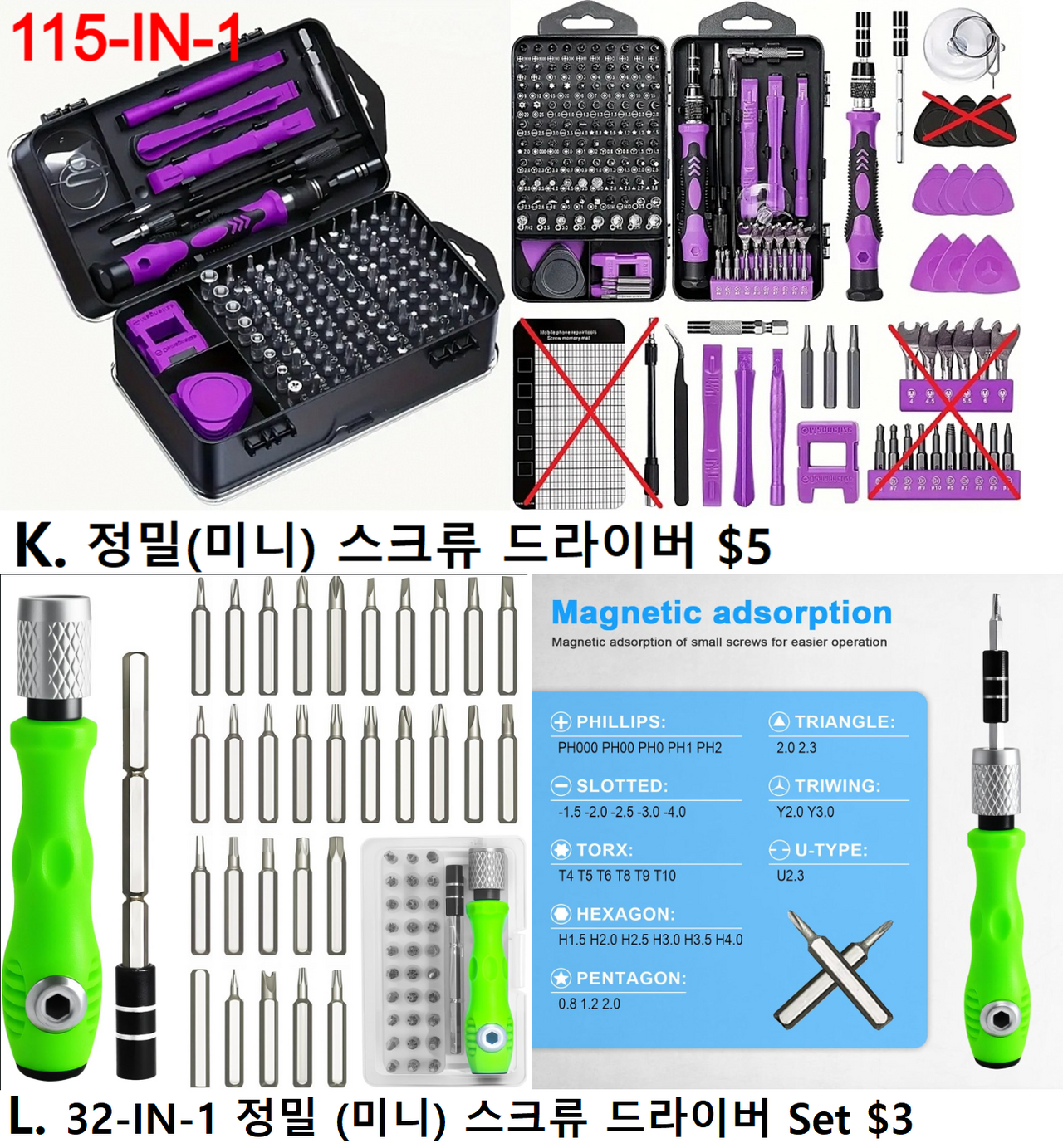 ❌ K. 115-IN-1 정밀(미니) 스크류 드라이버 Set $5 ❌