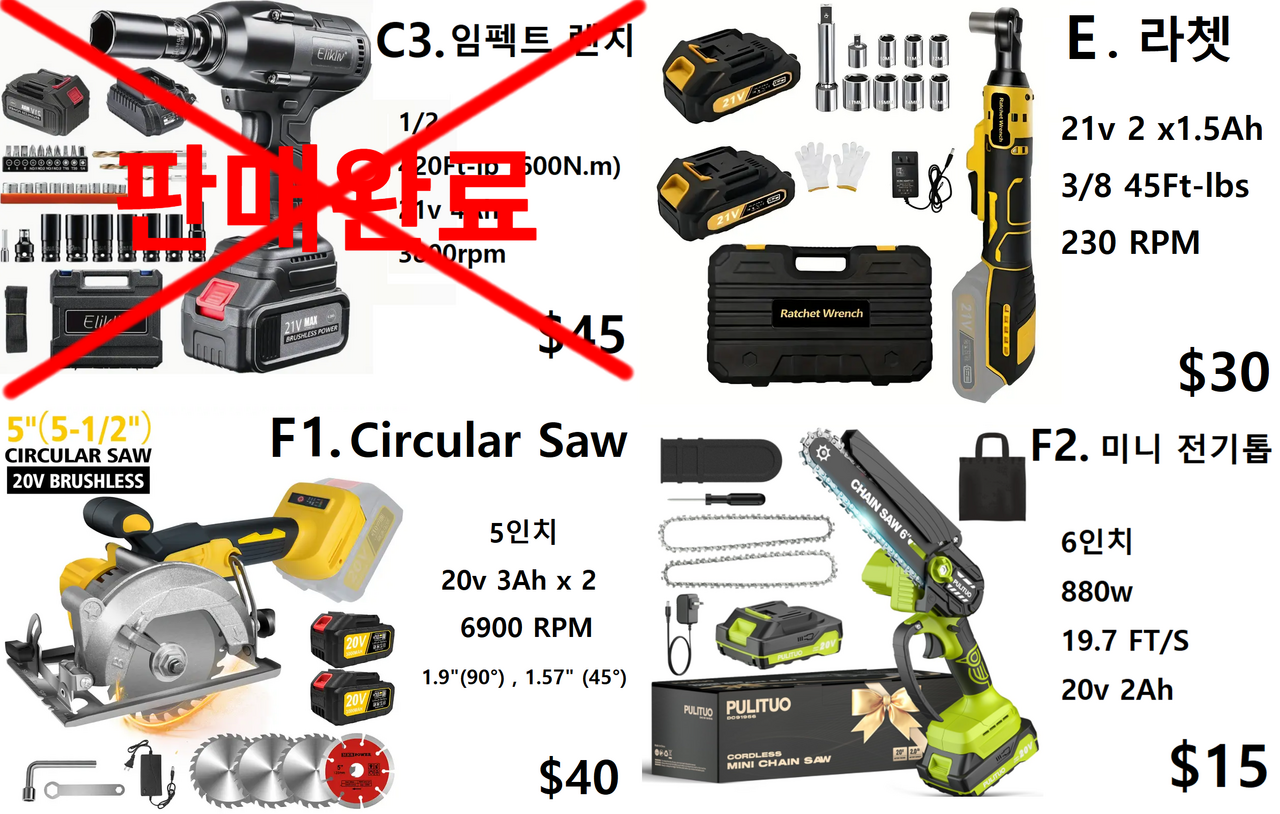 ❌ E. 라쳇 $25 ( 3/8 , 45Ft-lbs , 21v 1.5 Ah x 2 ) ❌