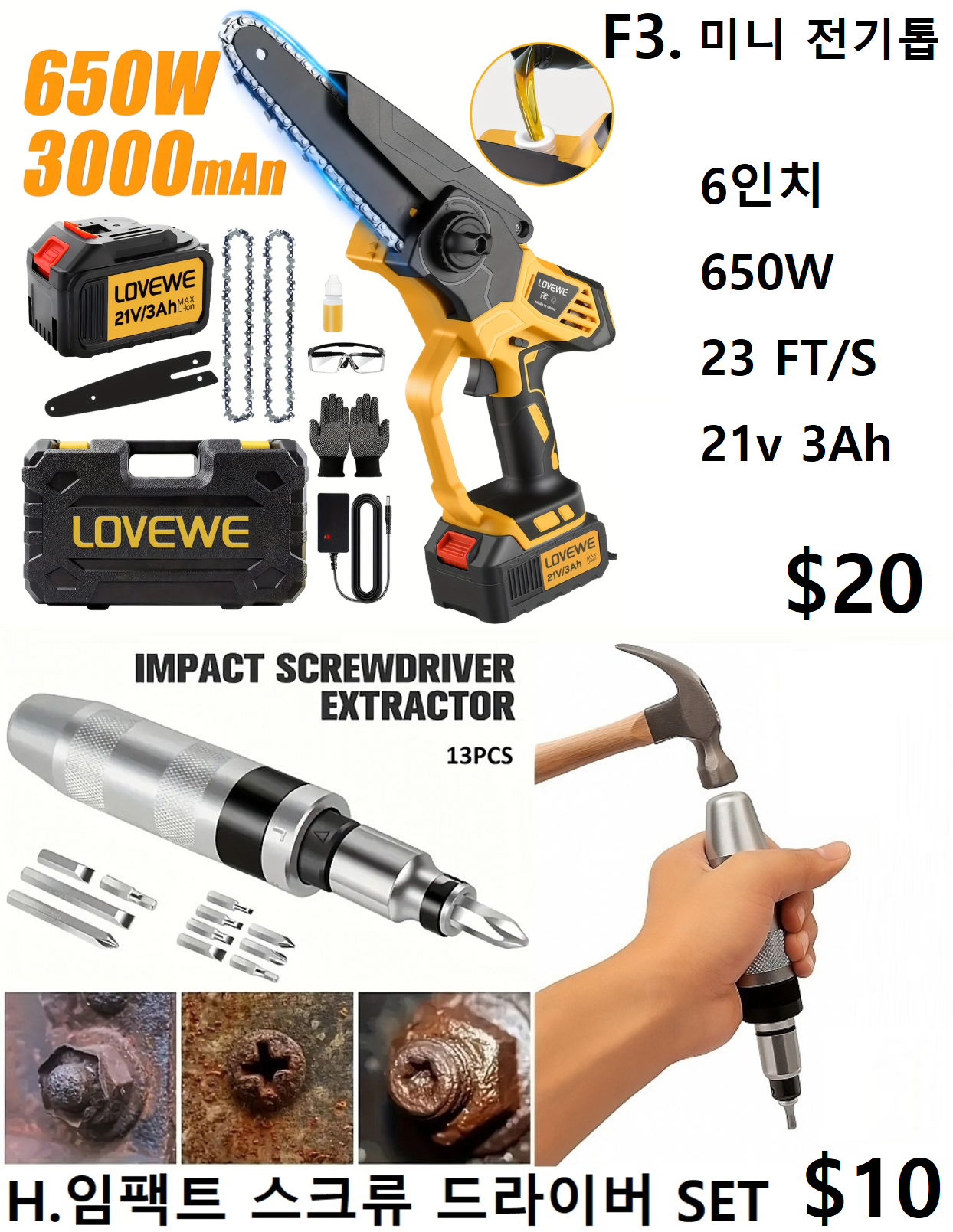 ❌F3 . 미니 전기톱 $20 ( 6인치 , 650w , 23 FT/s , 21v 3Ah ) ❌