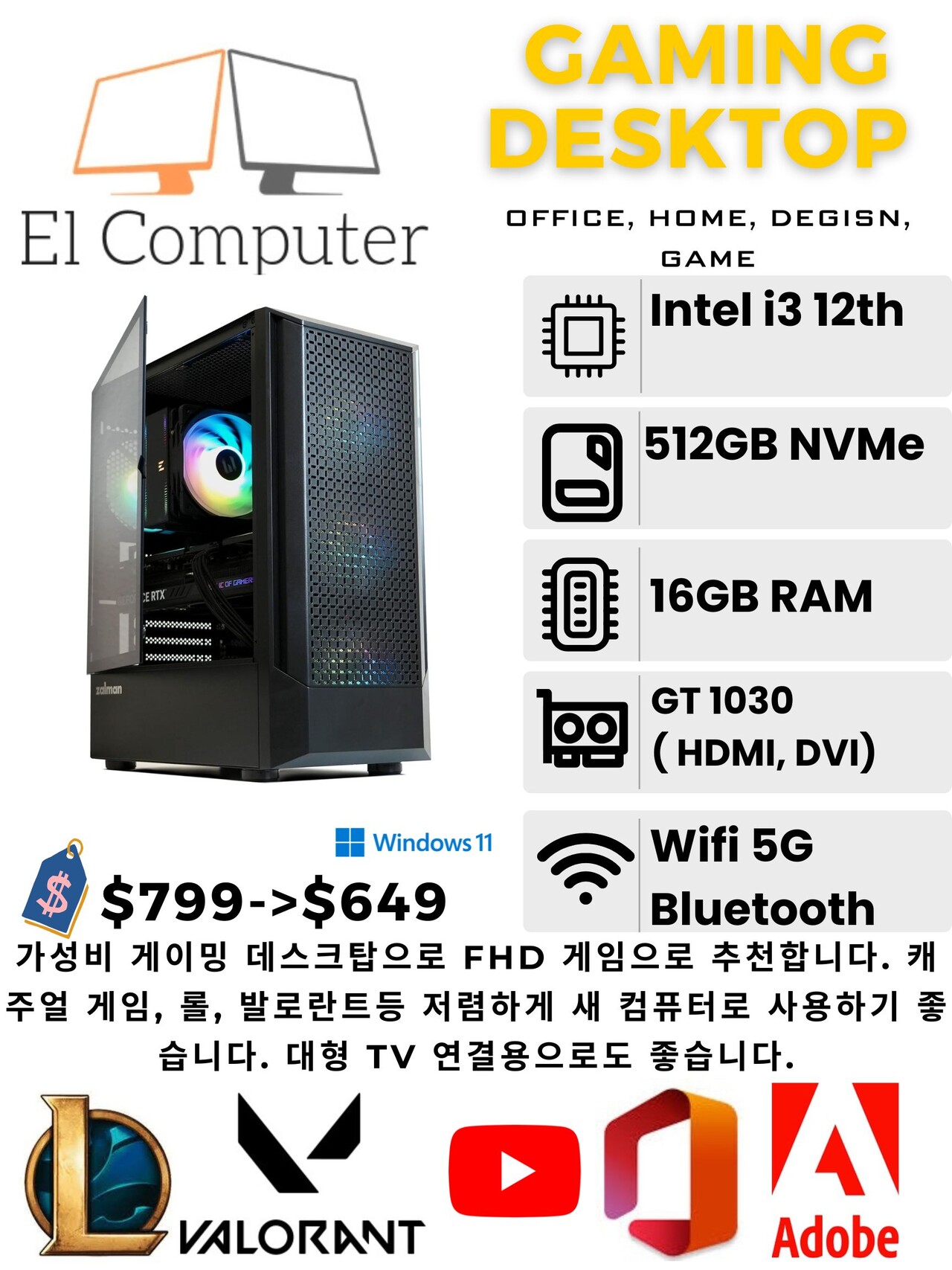 가성비 게이밍 데스크탑으로 FHD 게임으로 추천합니다. 캐주얼 게임, 롤, 발로란트등 저렴하게 새 컴퓨터로 사용하기 좋습니다. 대형 TV 연결용으로도 좋습니다.