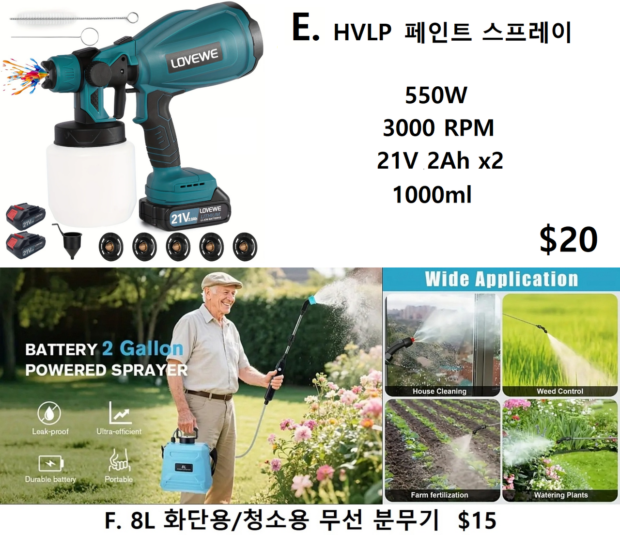 ❌ E . HVLP 무선 페인트 스프레이 ( 21V 2Ah x2 550W ) $20 ❌