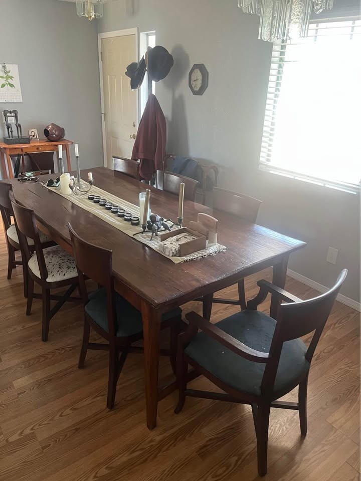 식탁은 프랑스제 이며 (10년전 $4500 주고 구매) , 거의 사용을 안해서 매우 깨끗하며 의자 8개 포함: $2000