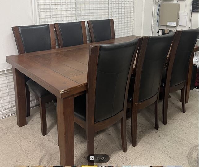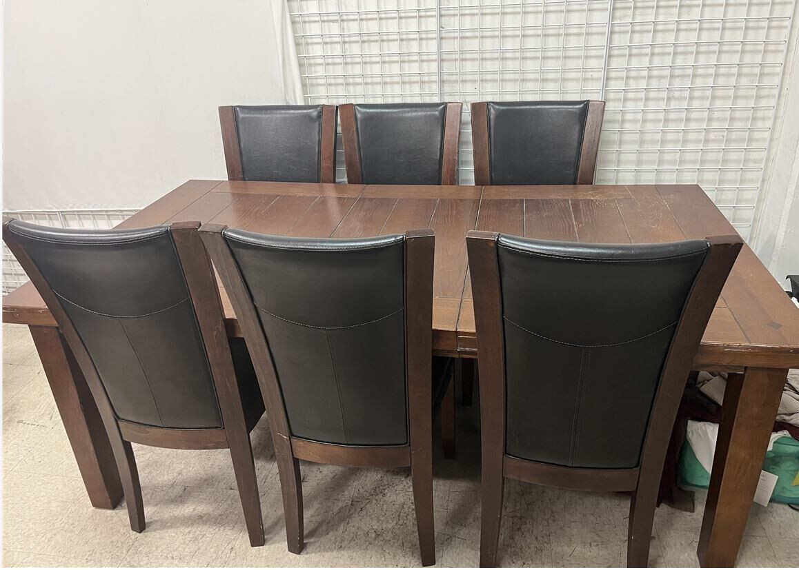 고급스러운 원목 테이블과 블랙 인조가죽 의자가 포함된 아름다운 7인용 식탁 세트로, 식사 공간에 따뜻함과 세련미를 더하세요.