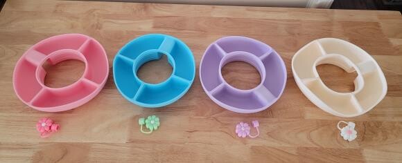 4개의 칸으로 나뉘어 있어 다양한 종류의 간식을 담을 수 있습니다.