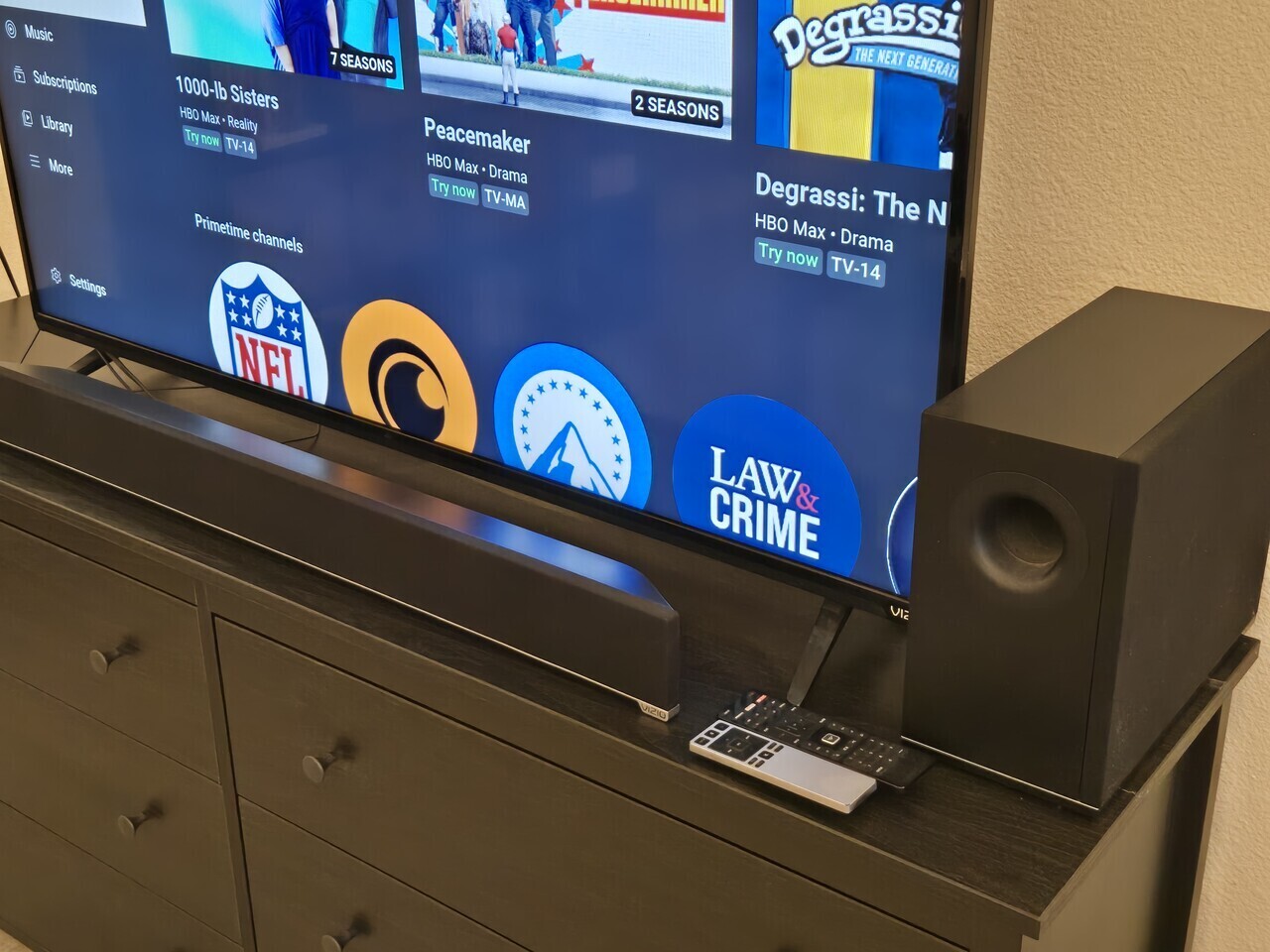 완벽한 세트 구성: TV 본체, 사운드바, 우퍼, 리모컨까지 모두 포함된 풀세트 구성입니다.