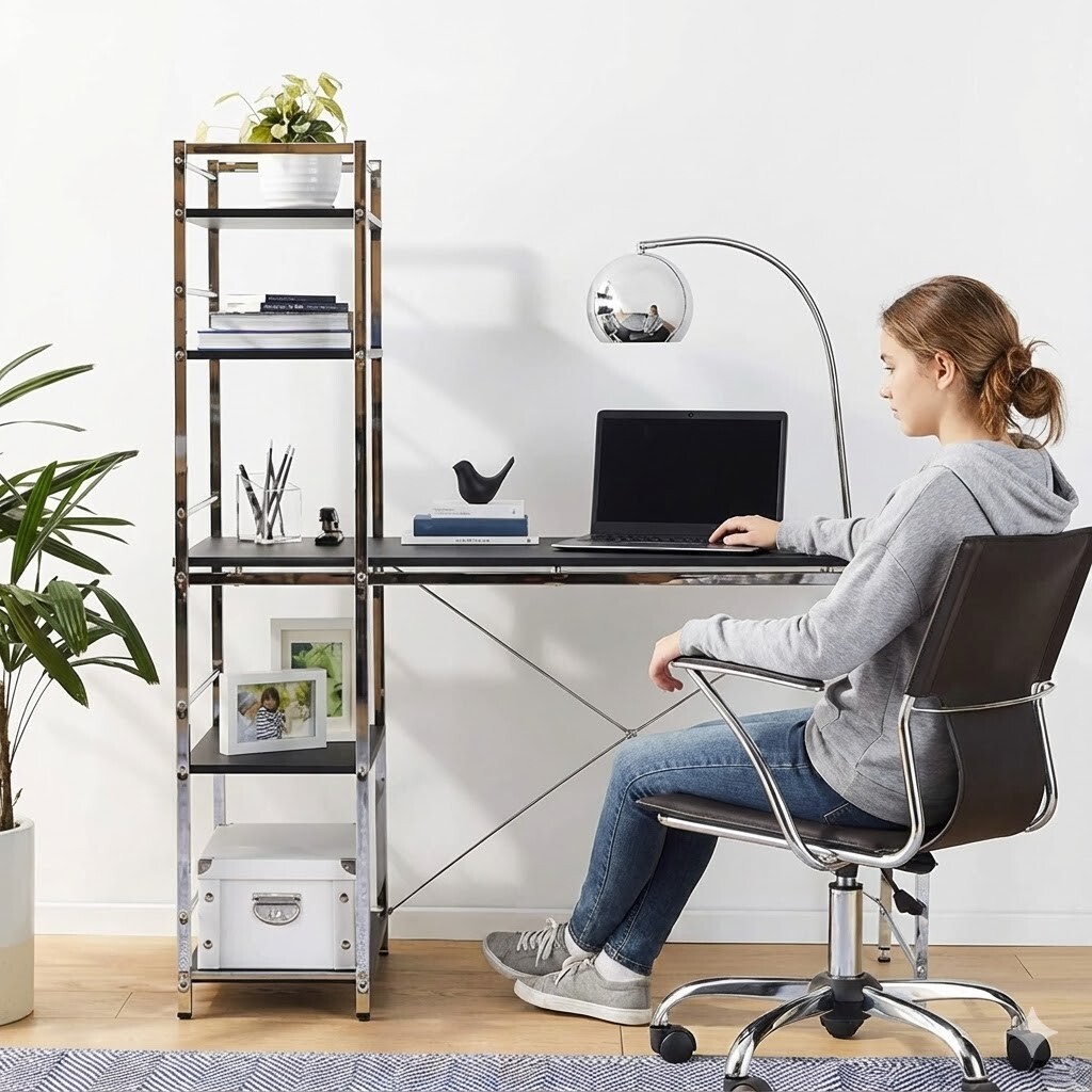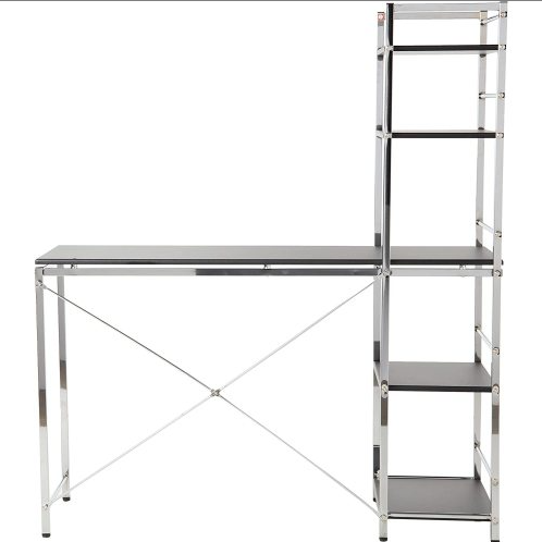 Elvis Chrome plated computer desk is a contemporary addition to your workspace. This desk has a black finish with chrome base, and with its built in book case for storing your books, CDs, and other necessities, this desk is sure to upgrade any room. One side the wide black wood desktop with plenty of room for using your laptop, writing, or studying, while on the other side is a five shelf black glass book shelf with bar backstops to hold all your books and studying materials. Some Assembly Required.