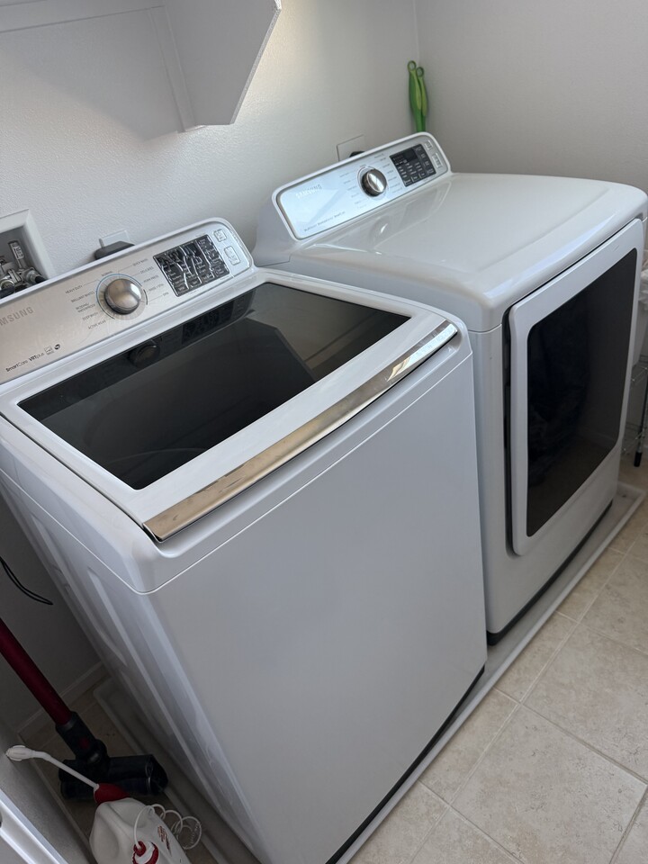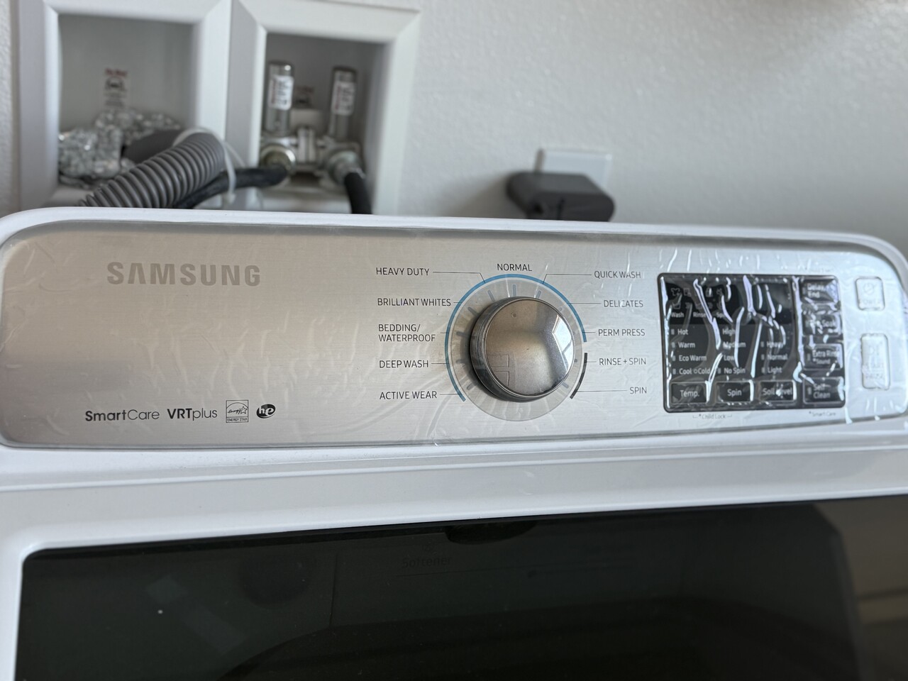 ● Samsung 5.5 cu. ft. Top Load Washer with Super Speed Wash and 7.4 cu. ft. Smart ELECTRIC Dryer with Steam Sanitize
