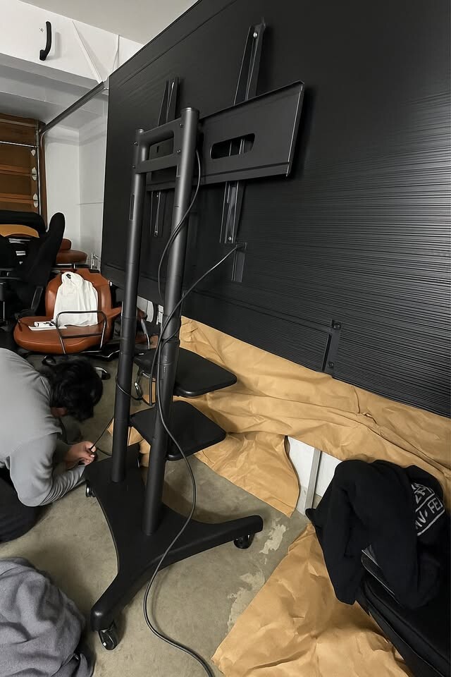 티비 하나는 롤링 스텐드에 올려져 있으며, 4k HDMI / Powercable 포함입니다. ($700)