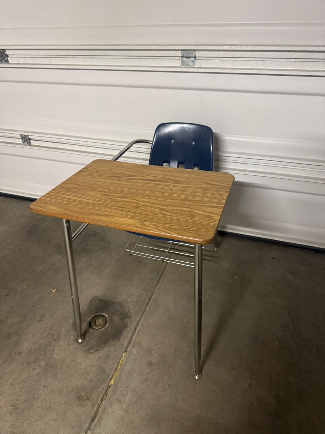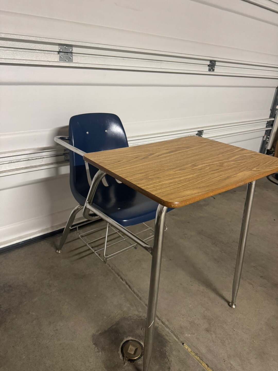 의자와 책상이 일체형이며, 아래쪽에는 가방이나 책을 놓을 수 있는 보관 선반도 있습니다.