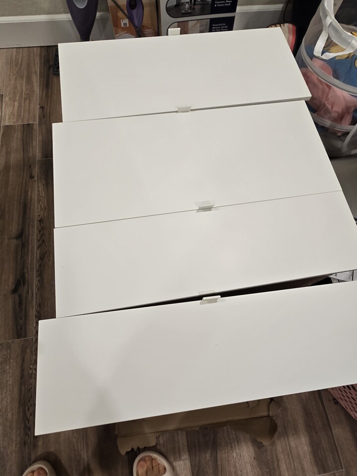 279불주고 구입했는데 조립중 가운데 칸울 거꾸로 했네요 여자혼자 다시 픽스하기어려워 가져가 재조립후 쓰실분 80불에 드립니다.서랍은 조립완료