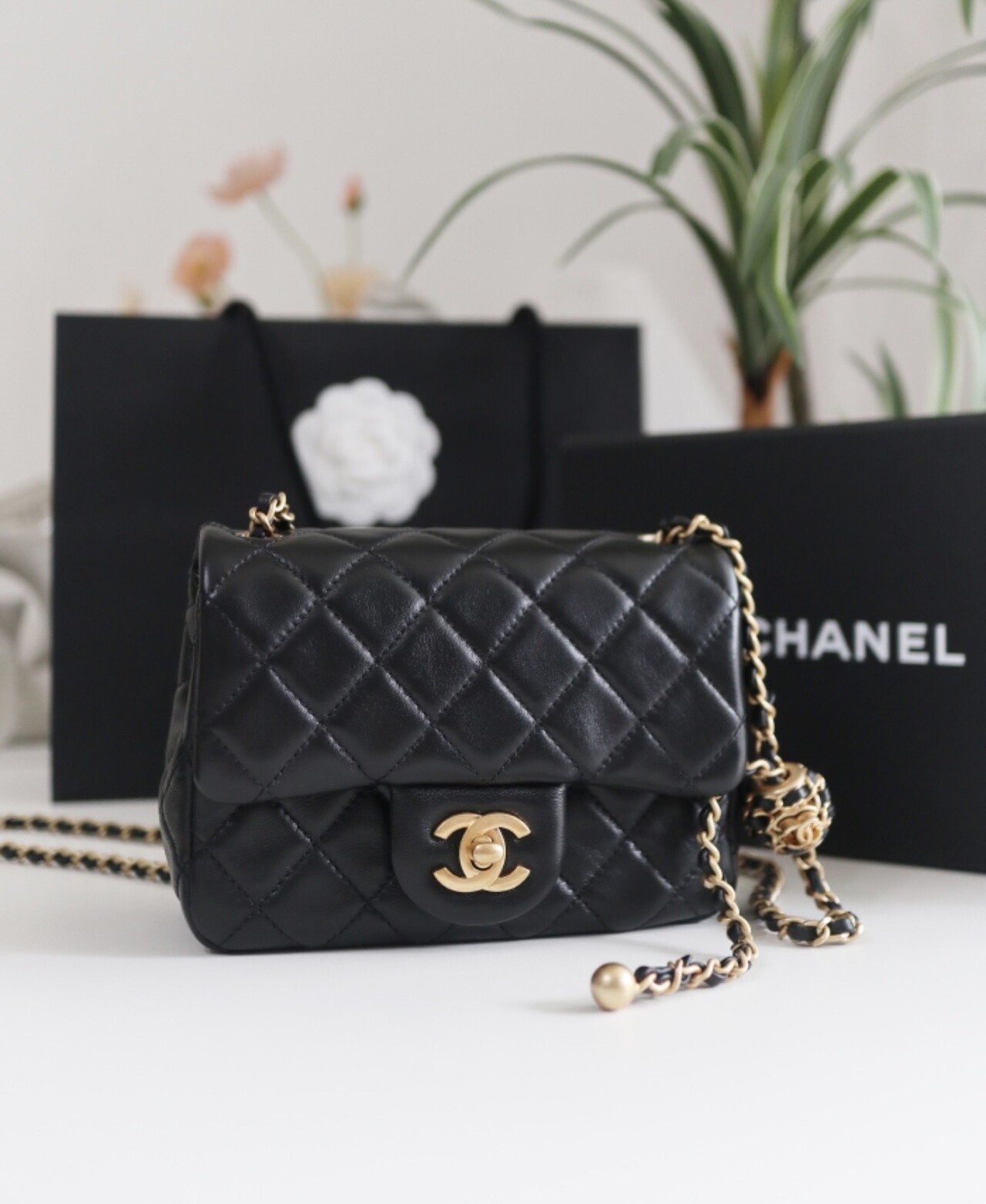 이 가방은 끈 길이를 조절할 수 있는 금볼(Pearl Crush)이 달려 있어서, 일반 미니백보다 훨씬 비싸고 인기가 많습니다