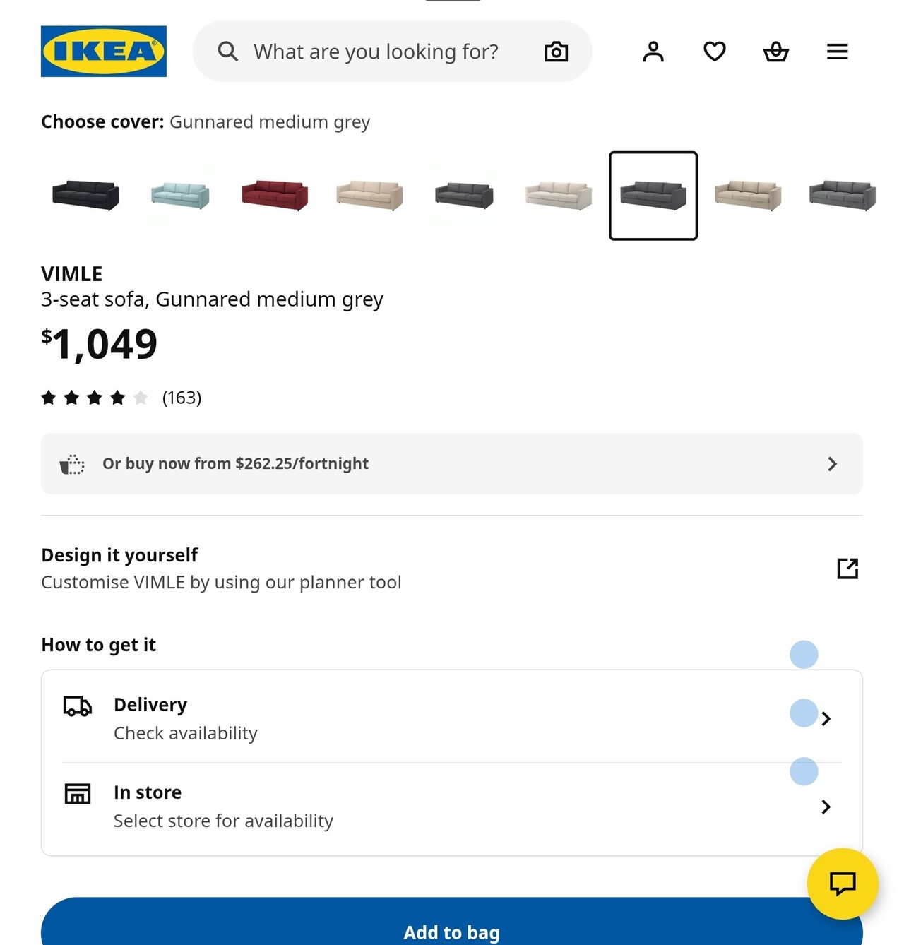 이케아 3인용 소파(모델명: VIMLE )로 1000불 이상 가격에 현재 이케아 웹사이트에서 판매 중인 모델이고,