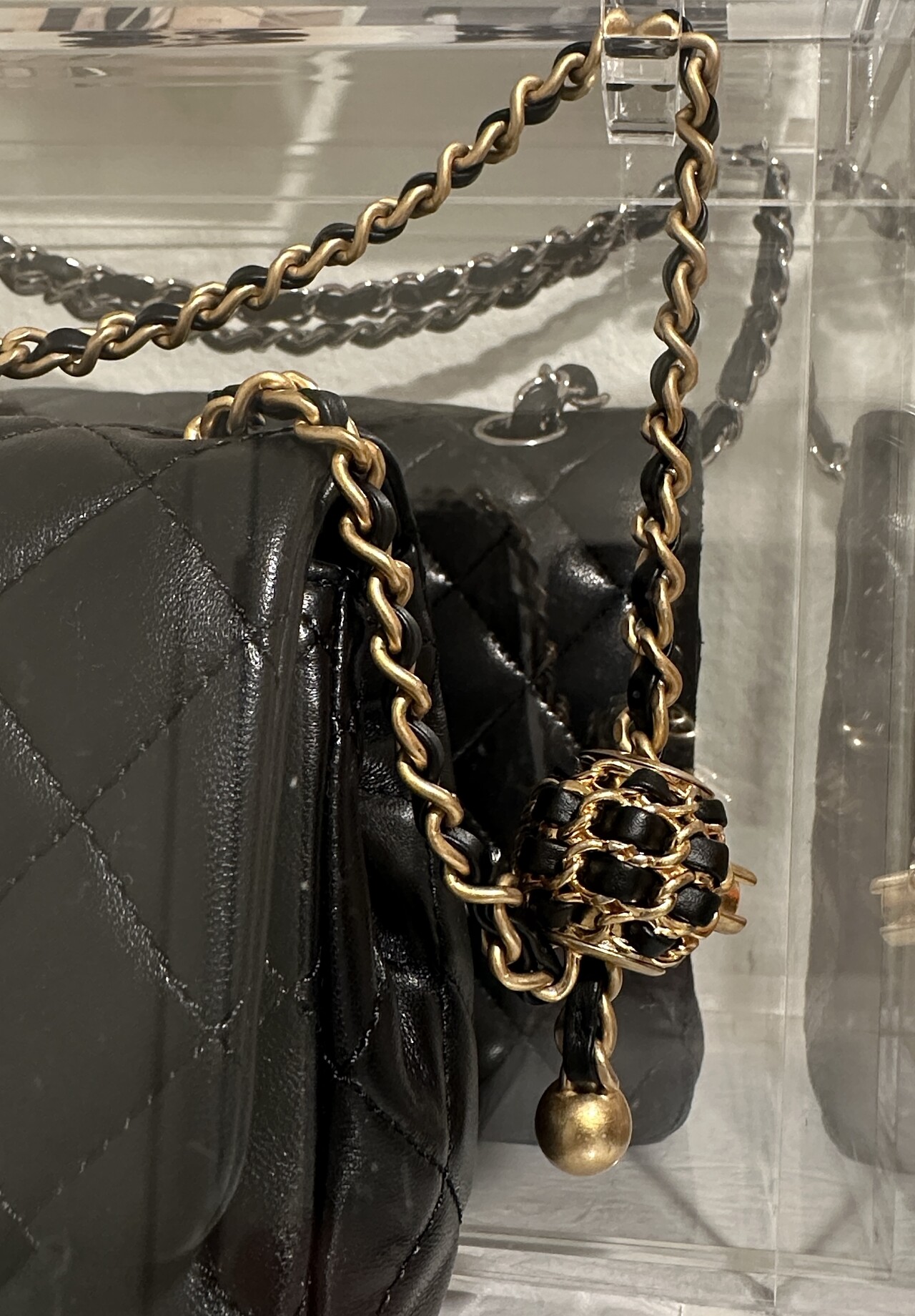 체인에 'CC 로고 볼' 디테일이 있어 일반 미니백보다 훨씬 비싸고 인기가 많습니다.