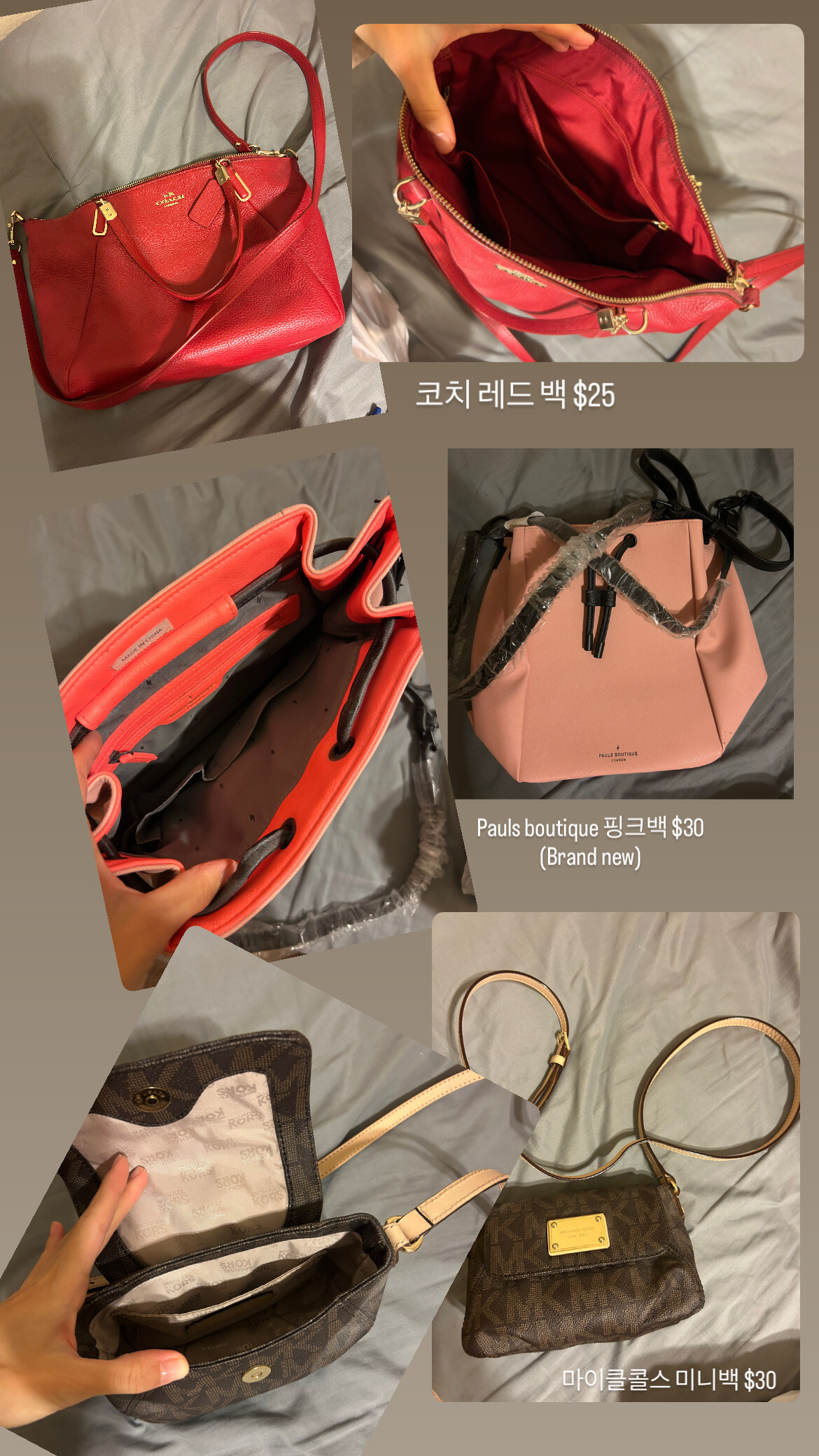 가방및 지갑 브랜드 coach, michael kors, kate spade 와 몇가지 브랜드의 구두도 팝니다. 상태는 거의 new 컨디션에 가깝습니다! 가격 네고 가능, 많이 사실 경우 할인가 더 추가해드릴게요! 한인타운 only! no cash! 이메일로 연락 주세요^^ ah.shully@gmail.com