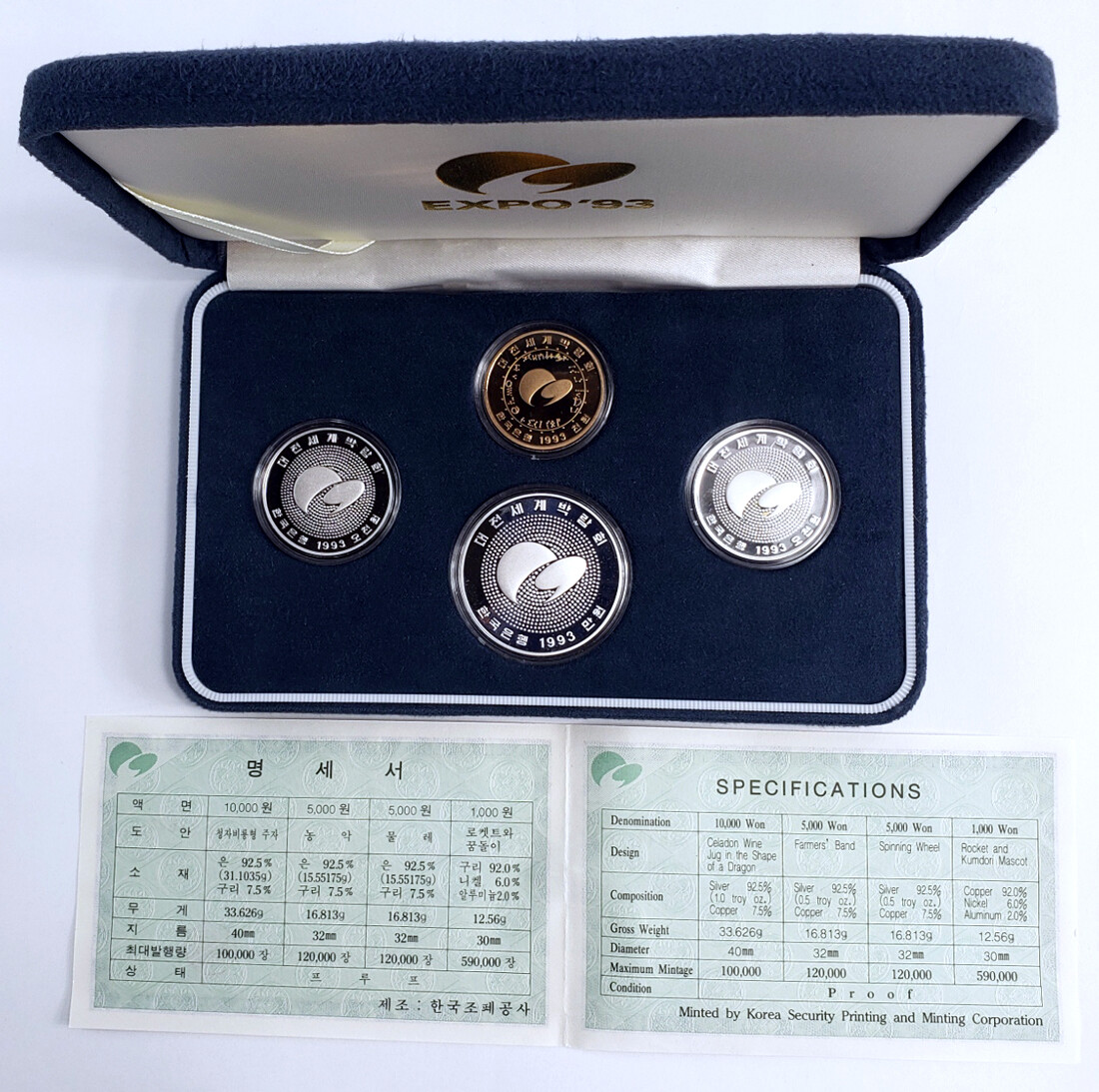 1993 Taejon Exposition Commemorative Silver & Copper Proof Coin Set, set of 4 coins - COA included.
