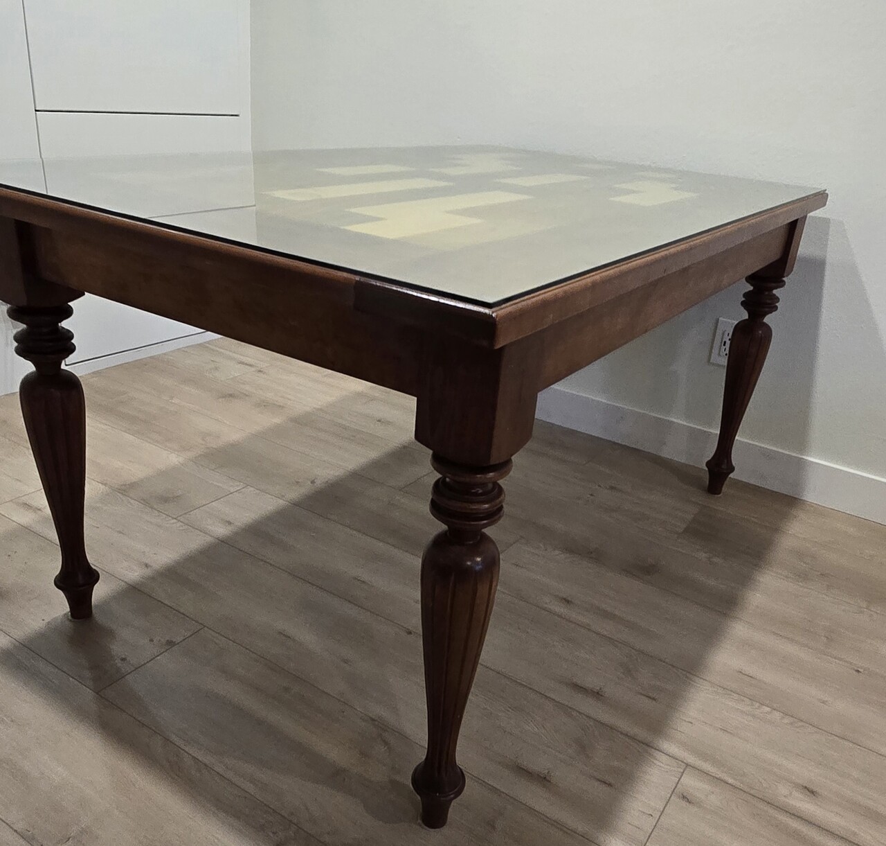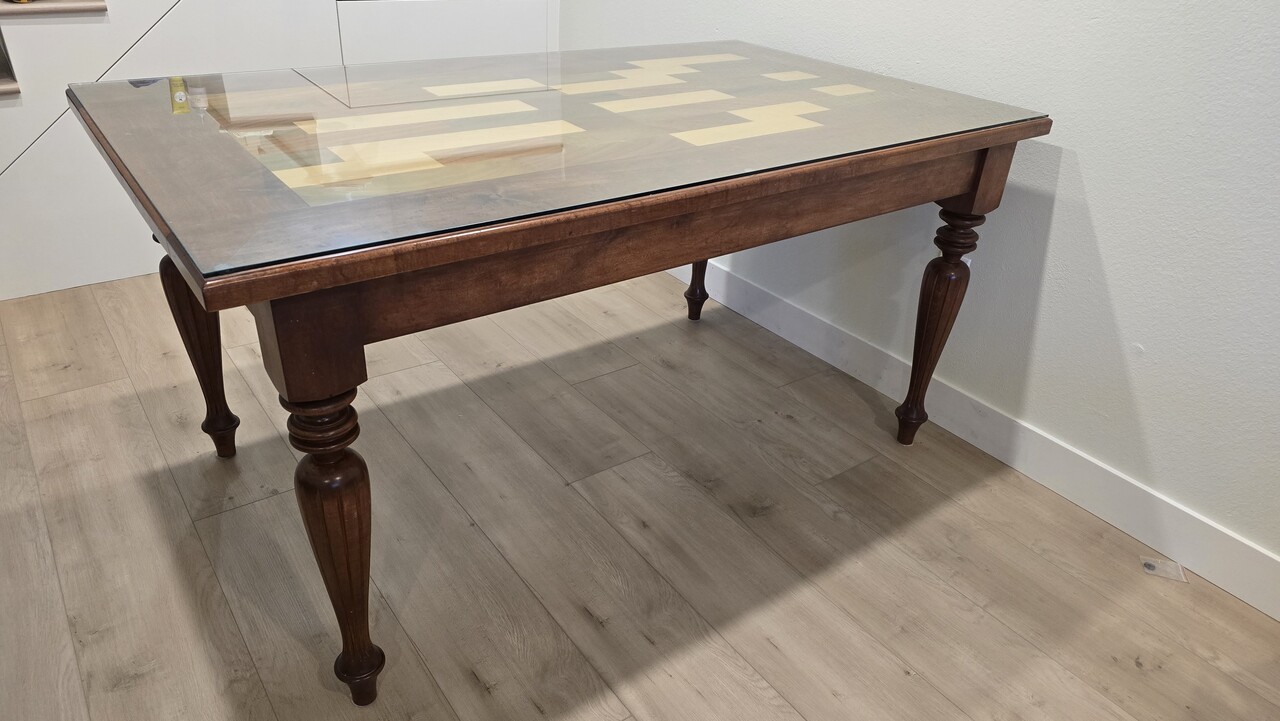 원목으로 되어있고 유리 탑이 있는 식탁입니다.
