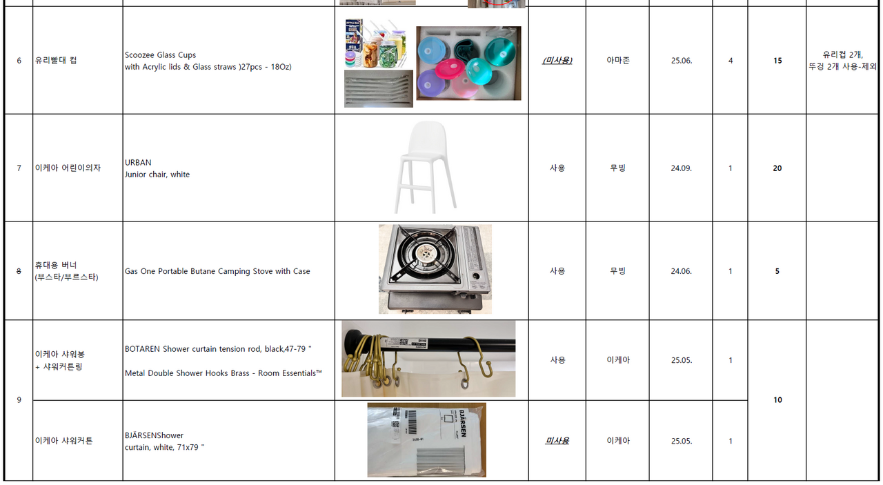 잡화: 이케아 모니터 받침대, 여행책자(미국,캐나다), 샤워해드, 유리빨대 컵, 이케아 어린이 의자, 휴대용 버너, 샤워봉(링, 커튼), LED 무선충전기