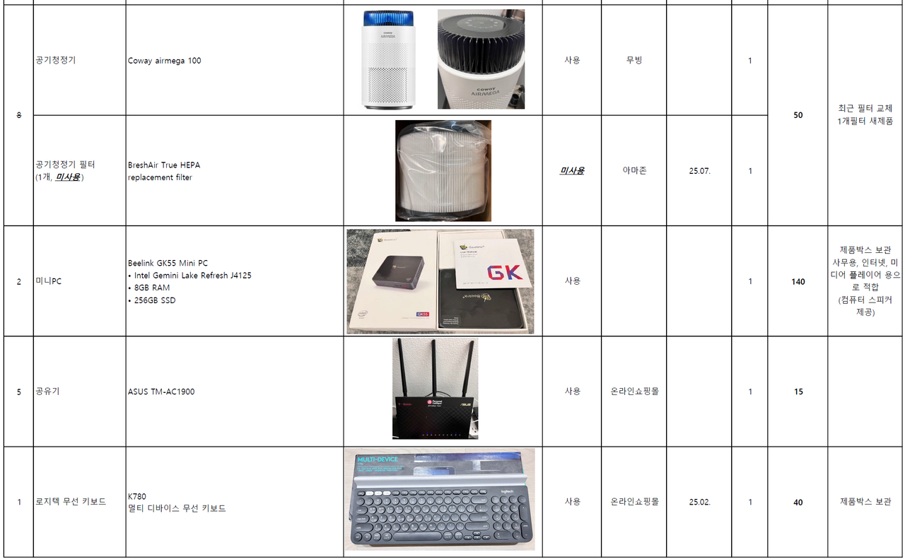 가전: 가습기, 에스프레소 머신, 거품기, 공기청정기, 미니PC, 공유기, 로지텍 무선키보드