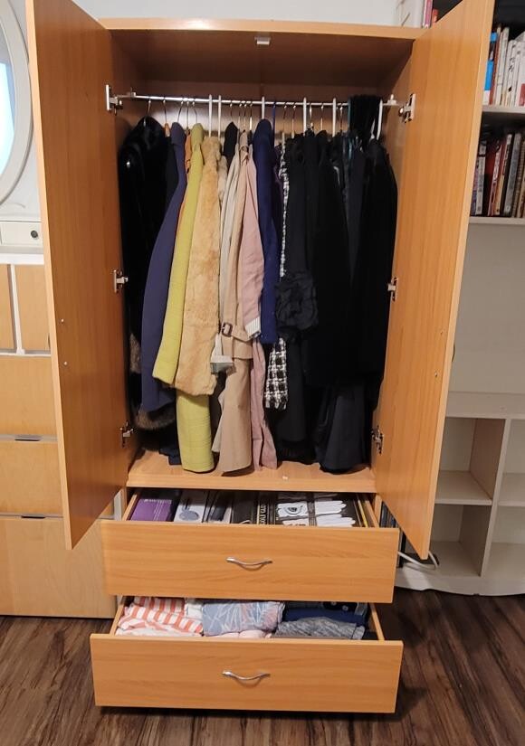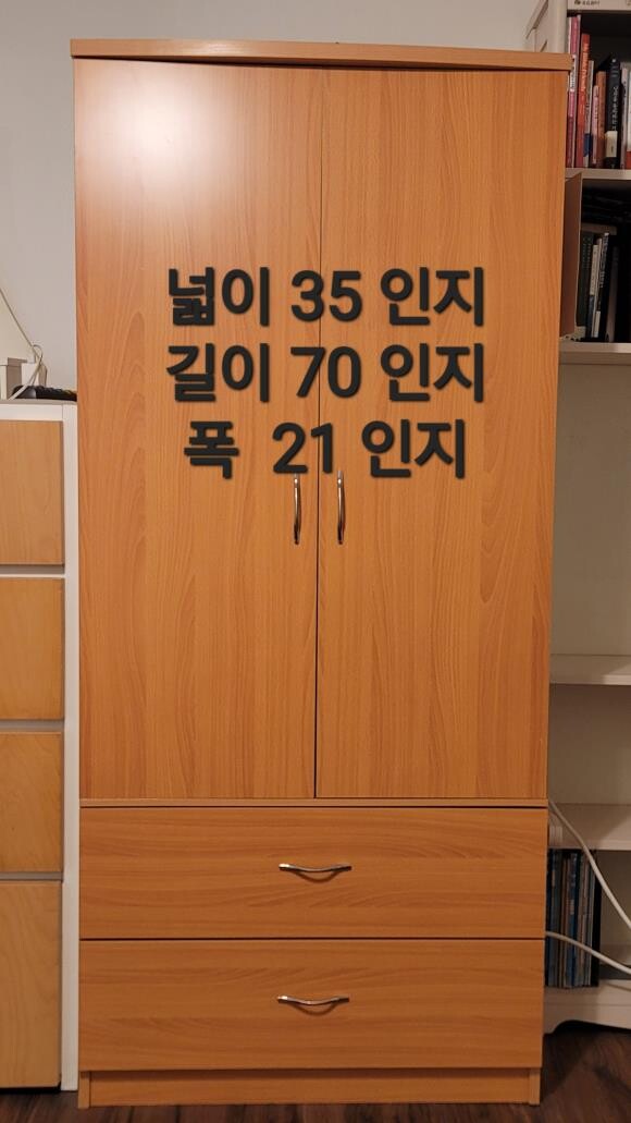 서랍2개와 봉이 있는 2도어 옷장 입니다.