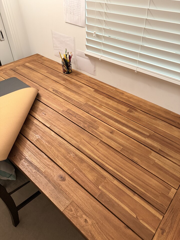 12. 공부방 우드 테이블 대형: 80불. 공부방 책상 & 아웃도어 아웃도어 다이닝테이블 사용 가능. 테이블 보관 커버 있음. 매우 깨끗