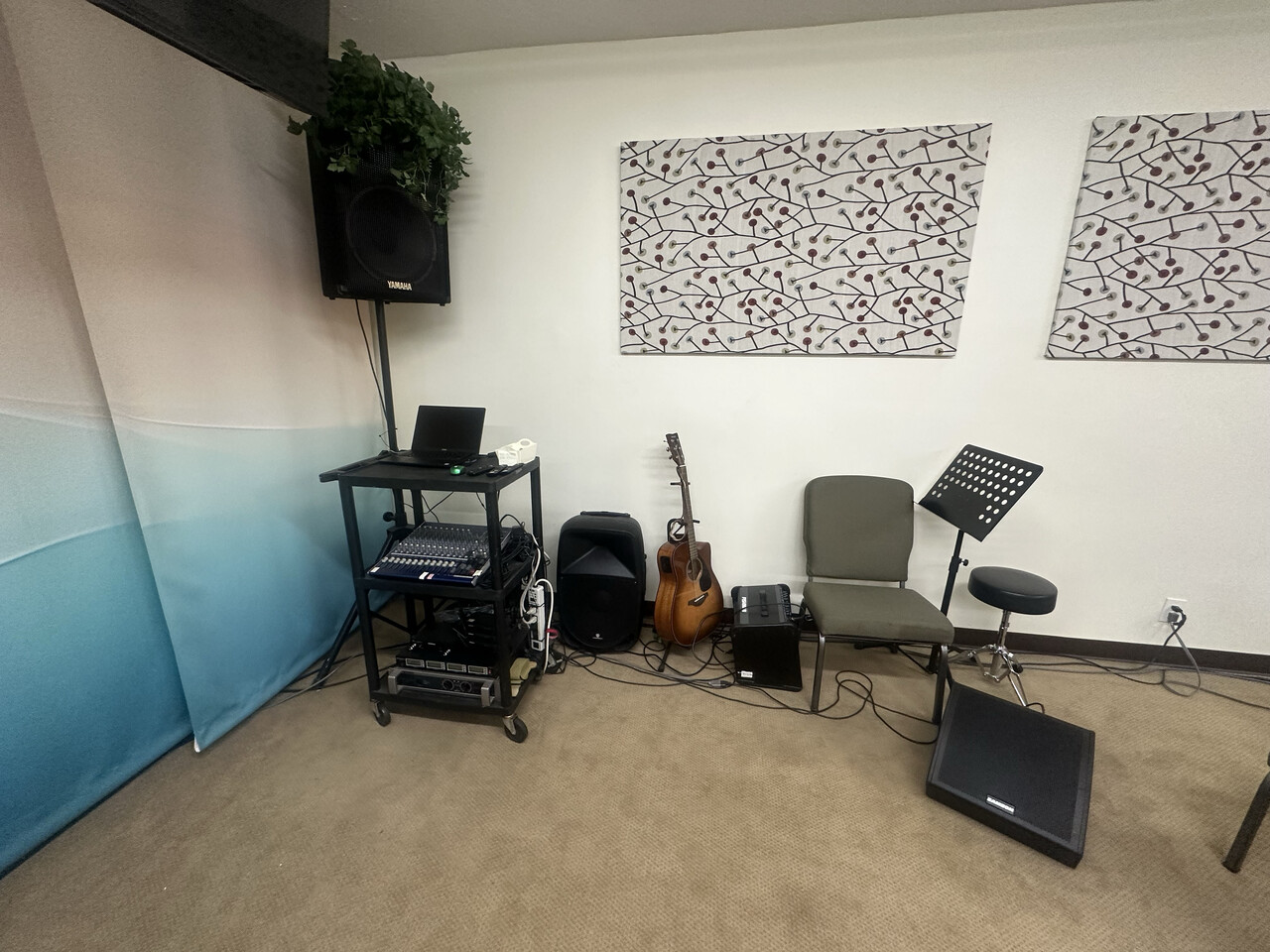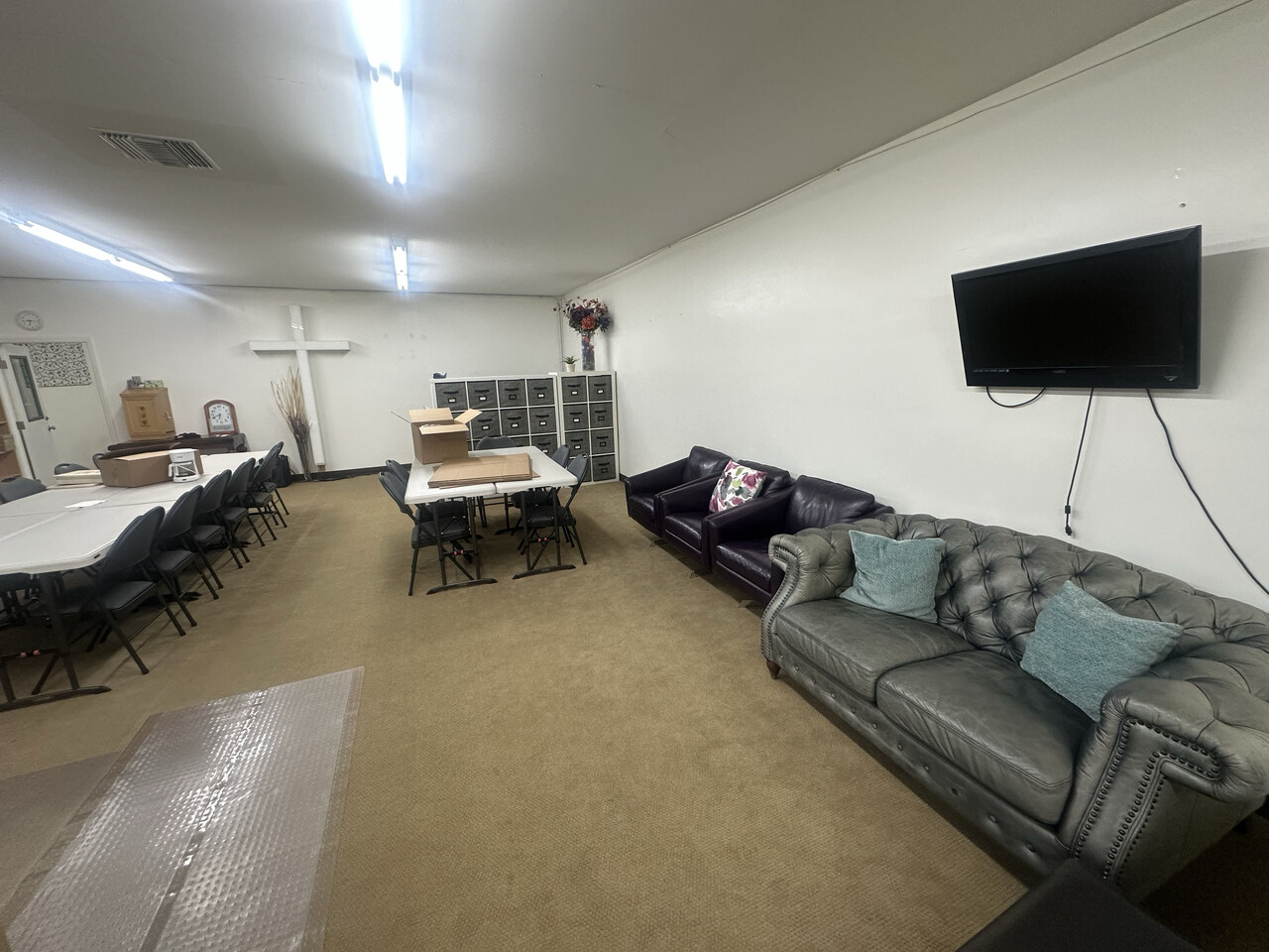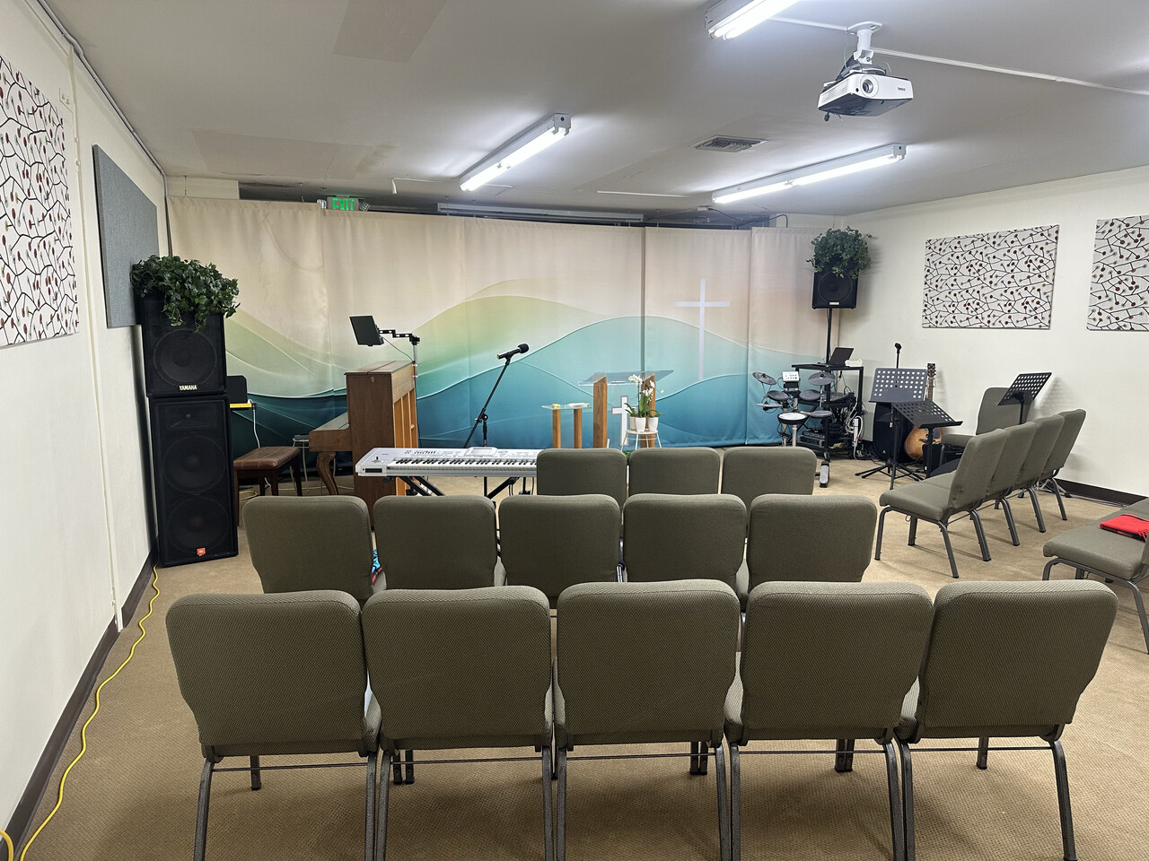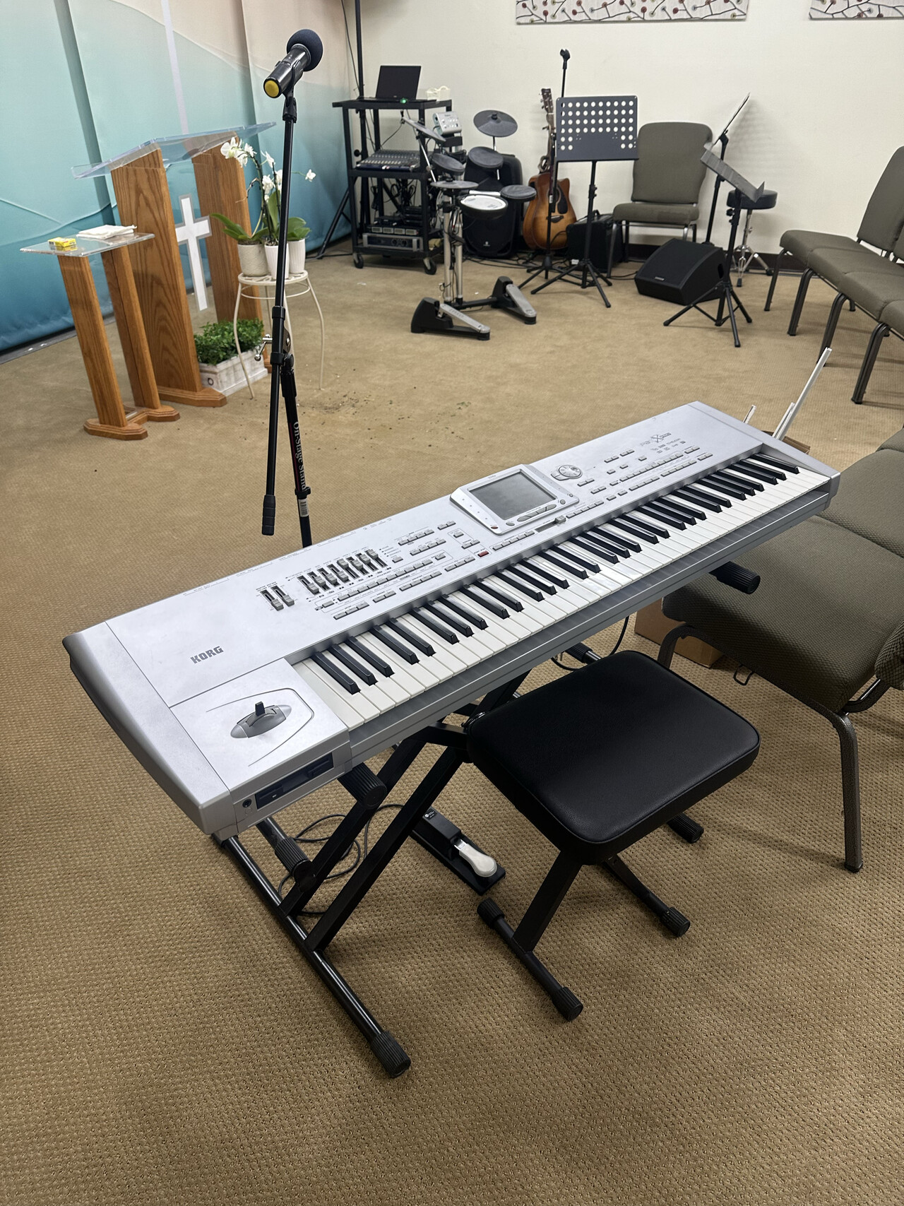 의자 70석, 소파, 친교 테이블, 전자드럼, 키보드, 피아노, 음향 장비 등등 사진에 보이는 모든 것 정리합니다.