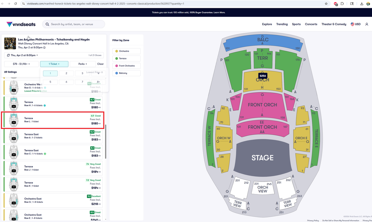 Terrace 섹션의 Row L 101-105 좌석표를 각 $80에 드립니다. 첨부된 화면캡쳐 사진들을 보시면 아시겠지만 L열은 LA Phil에서는 $112, Stubhub에서는 $168, Vividseats에서는 $180에 판매되고 있습니다.