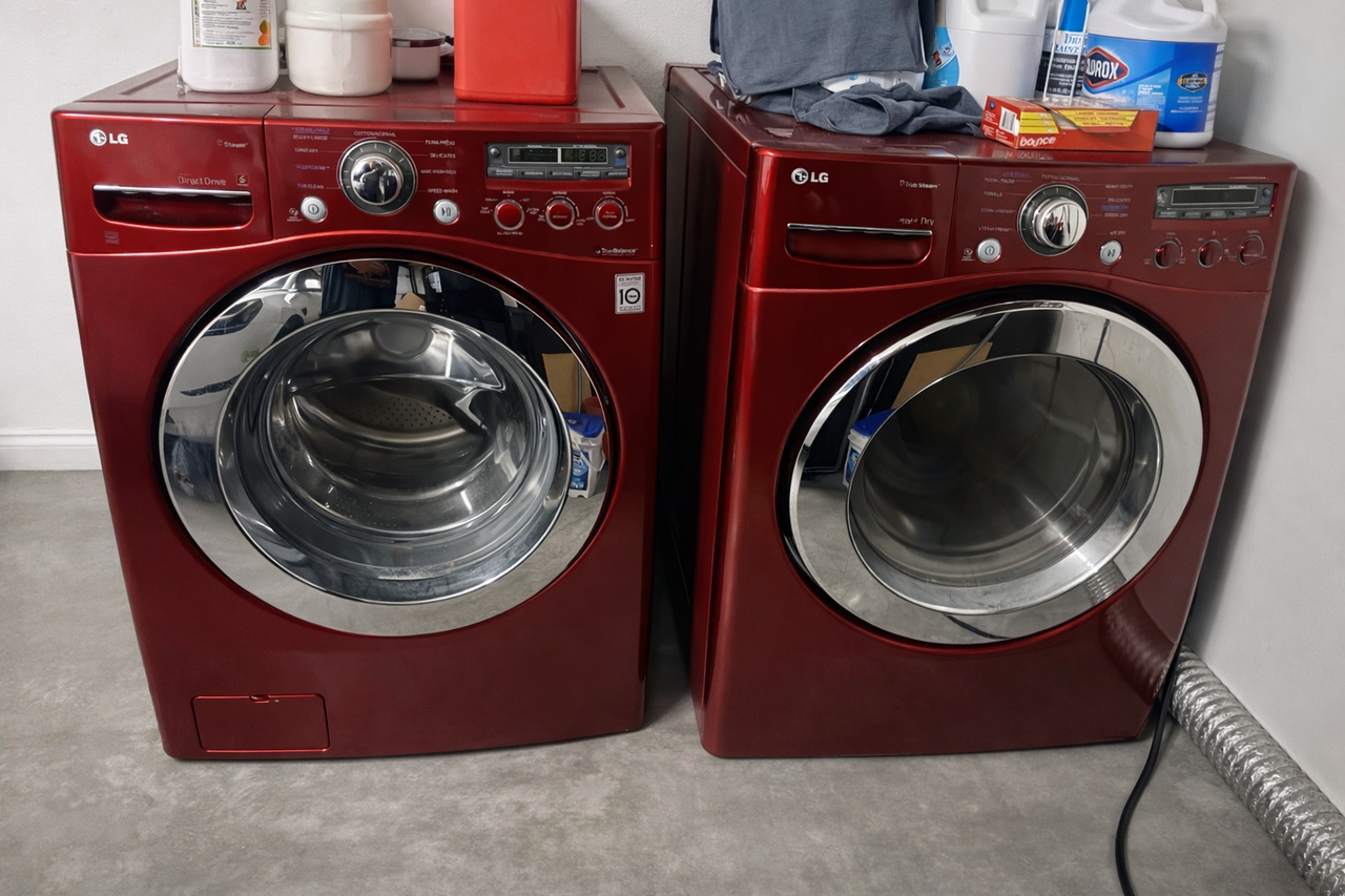 레드 컬러 LG 드럼 세탁기 & 건조기 세트입니다.