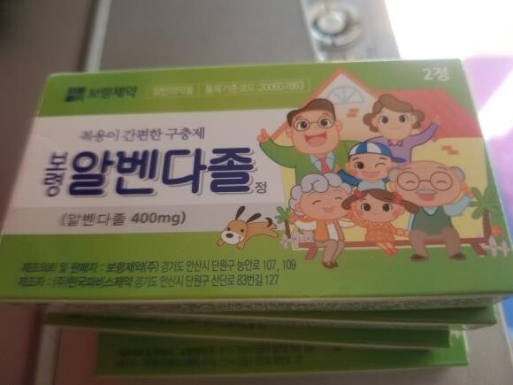 한 통에 알벤다졸 정제가 2정 들어있고 1알 복용 1주일뒤 1알을 구충제는 함께 사는 가족은 같이 복용하는걸 권장하고요. 1인1통 복용, 설명서 참고 하세요